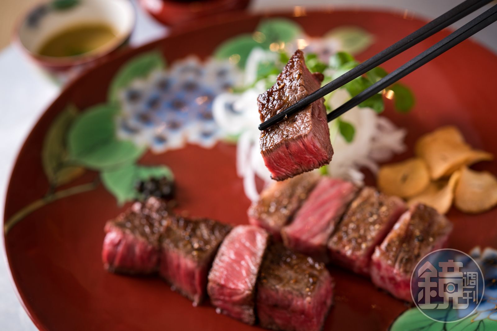 230度的油溫封住肉汁,鐵板將肉炙上焦褐香脆的表皮,下刀切開,內裡依然紅嫩。井上建議從肉香鮮明的臀肉吃,感受田村牛獨特的旨味,再嘗油花豐美融口的沙朗。