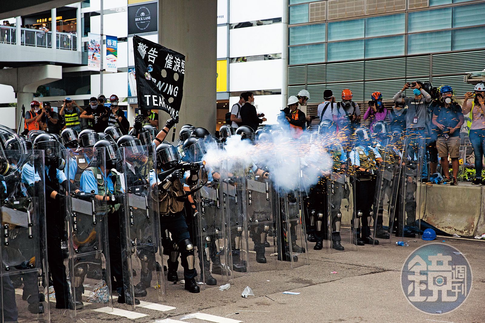 警民對峙相距數公尺的縫隙中,一位社工拉著音箱與麥克風,不斷對警察喊話:「保持冷靜!警察應該是保護人民,我身上什麼都沒有,真的不知道你們要對我怎樣?」她用身體橫亙在武裝警察面前,簡直是六四坦克人翻版。