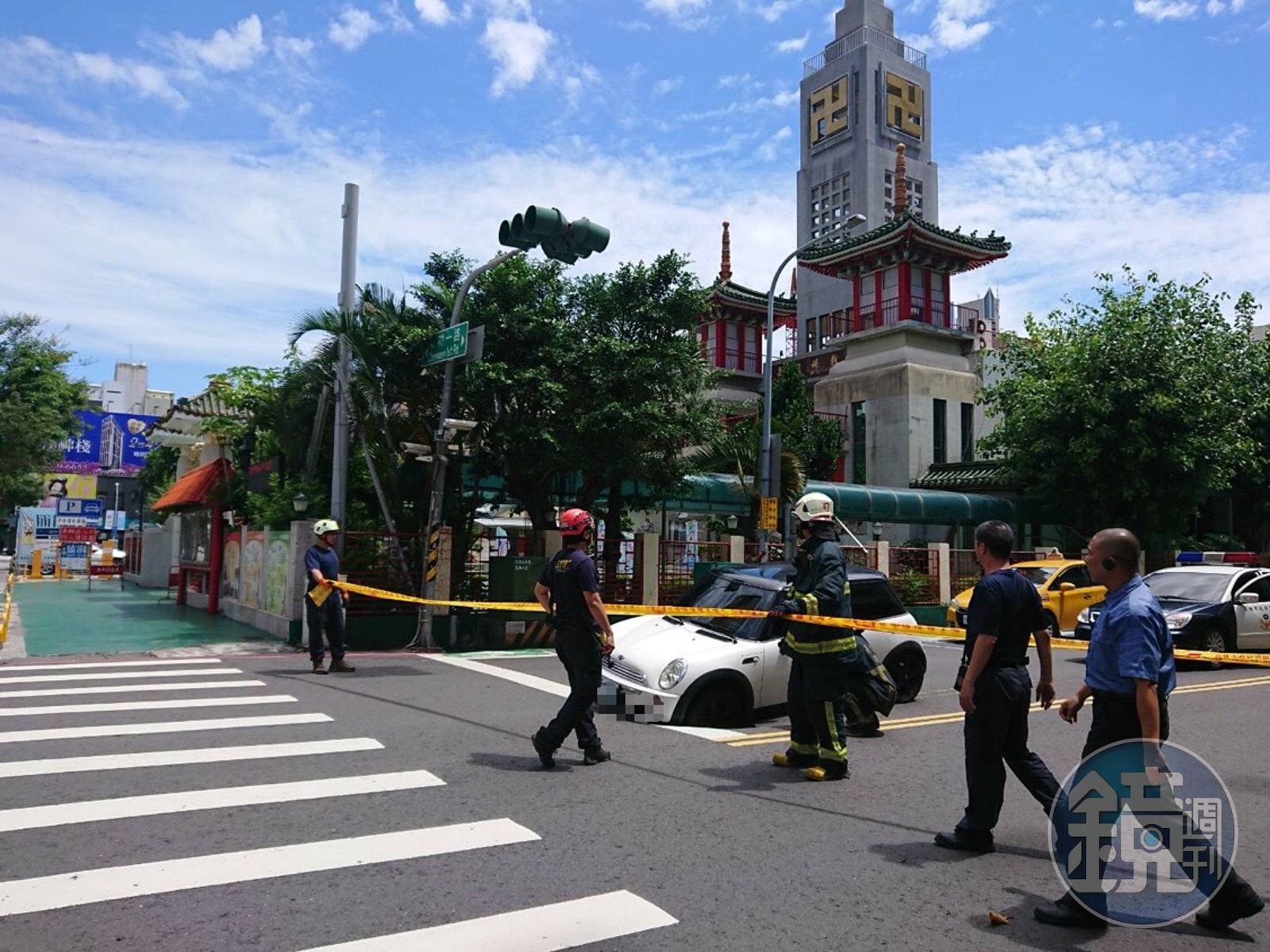 名車陷入坑洞,現場拉起封鎖線。(翻攝畫面)發布時間:2019.06.18 13:31 臺北時間