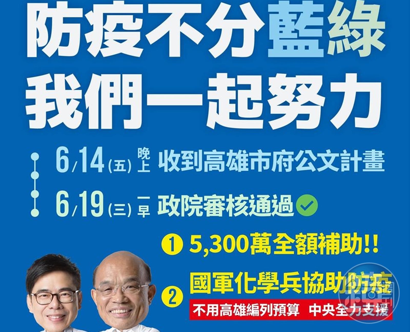 高雄市長韓國瑜近日多次為了登革熱預算砲轟行政院長蘇貞昌,甚至痛批中央將登革熱防疫當成「政治武器」。不過就在韓不斷口水戰時,蘇貞昌今(19)日於臉書po文宣布,行政院已審核通過登革熱補助,強調「高雄市需要的5,300萬經費,#全額補助。」還要求國軍化學兵隨時待命,全力協助防疫工作。
