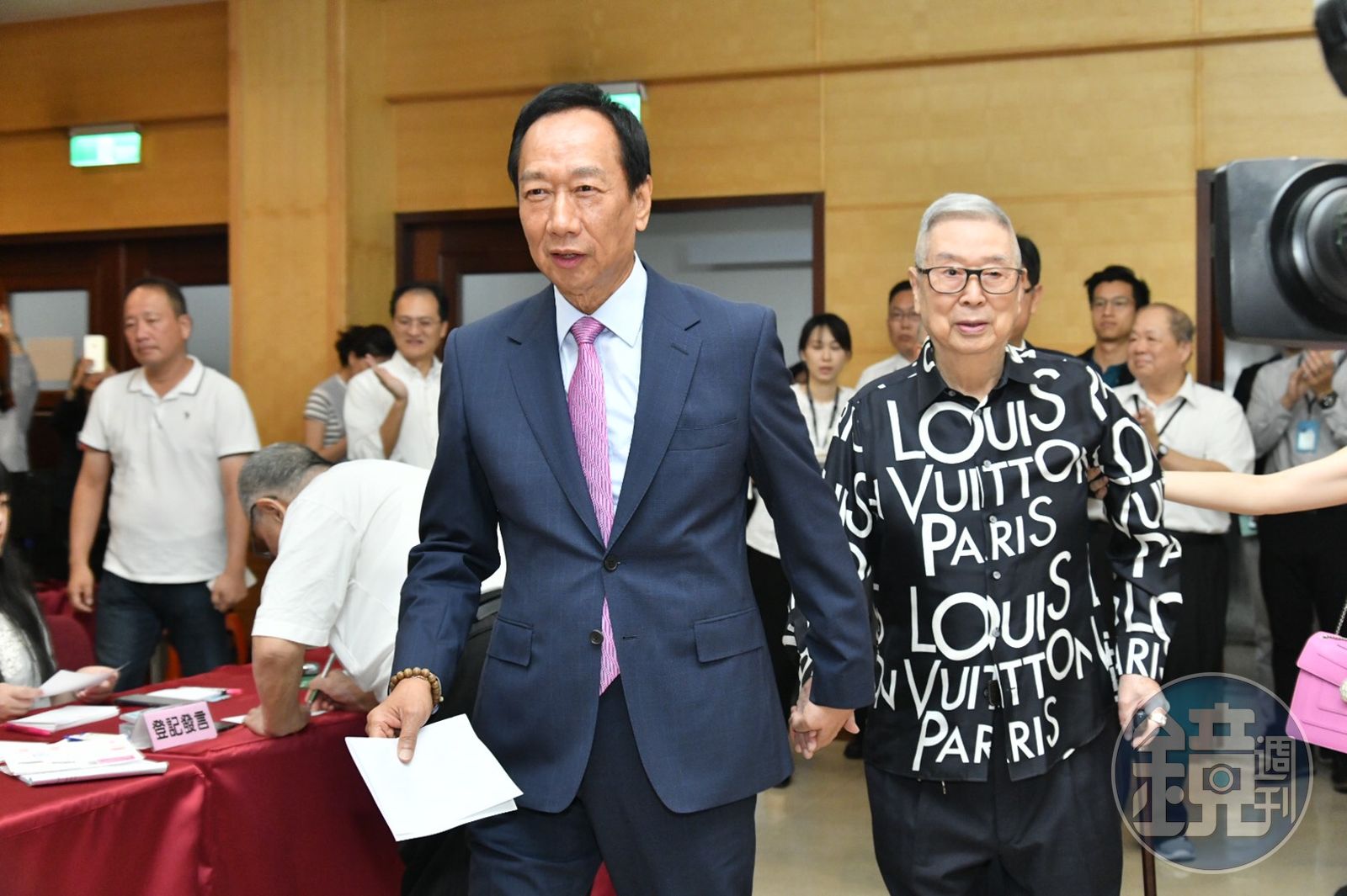 股東會開始前,長期力挺郭董、資深股民阿土伯由郭董手牽進入主會場,阿土伯語帶感性地說,「台灣的經濟只有郭總統才能救,非常高興郭董出來救台灣,我已經講了3年了,只有郭董才能讓台灣好,真的是三請孔明。」