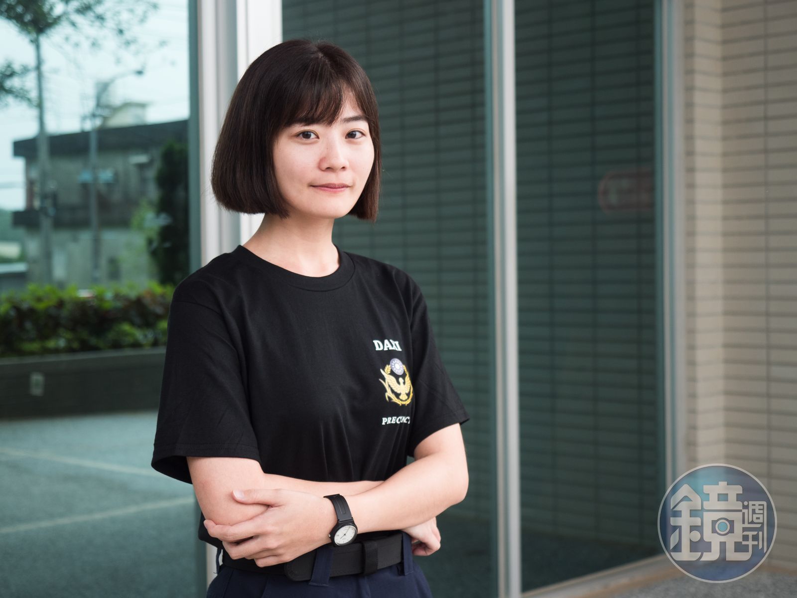 28歲的女警蔡美萱穿著印有DPPD字樣的的T恤,可說相當帥氣。(翻攝畫面)桃園市警局大溪分局為順應現在年輕人的網路使用習慣,除了已在臉書成立「大溪警好讚」,更特地在Instagram上創建粉絲專頁,希望能藉此貼近年輕族群,大溪分局甚至還製作了黑底白字的帥氣T恤,背面大大印著「DPPD」代表大溪分局的4個英文字,讓警局同仁在下班後也能穿著增加見警率。