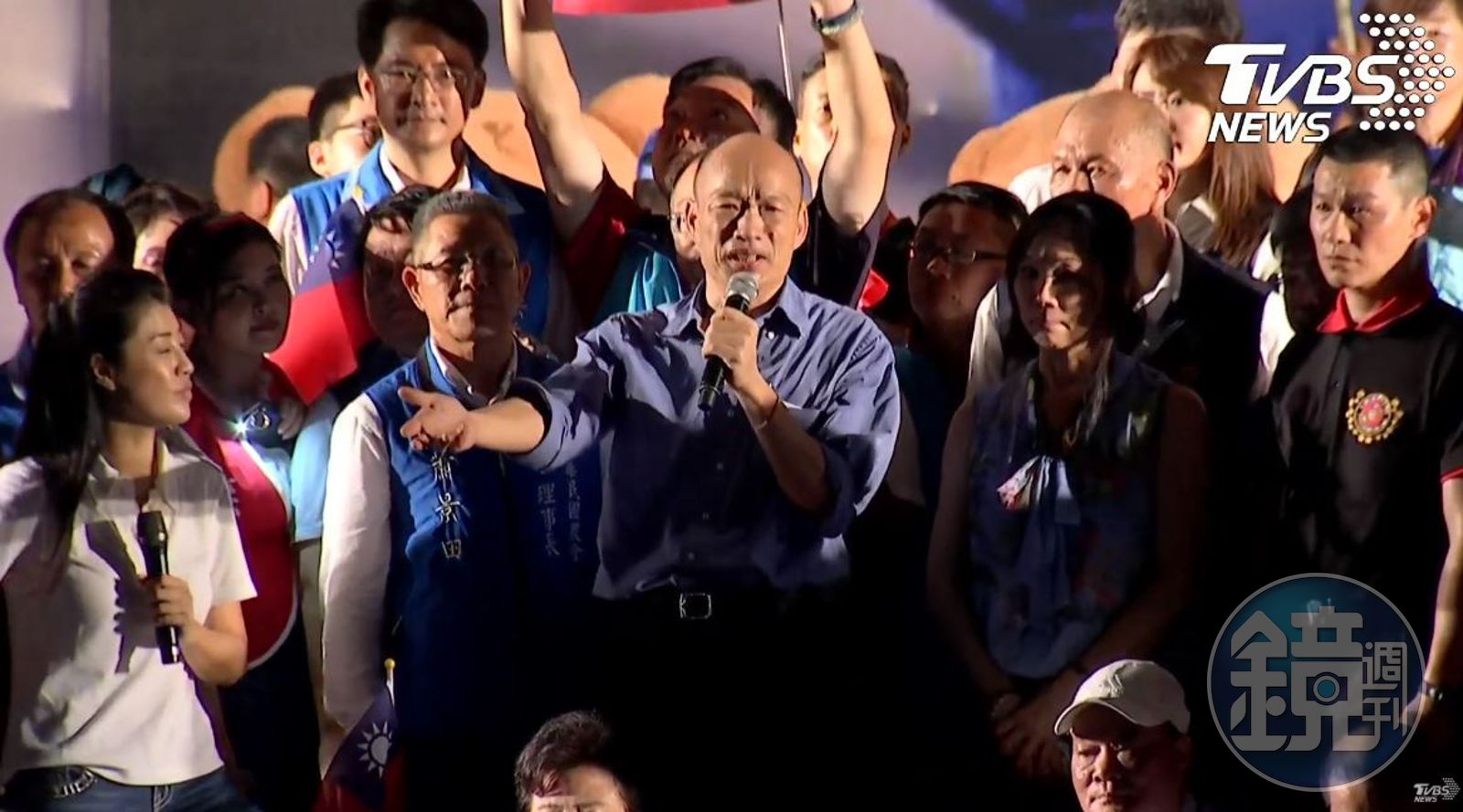 韓國瑜與妻子李佳芬晚間7點20分搭車進入會場,光是從台下經過支持者就走了10分鐘以上,現場主持人不斷大喊「韓國瑜凍蒜」、「庶民選總統,總統選庶民」,掀起一波波高潮,而韓粉則是人手一機大喊總統好。