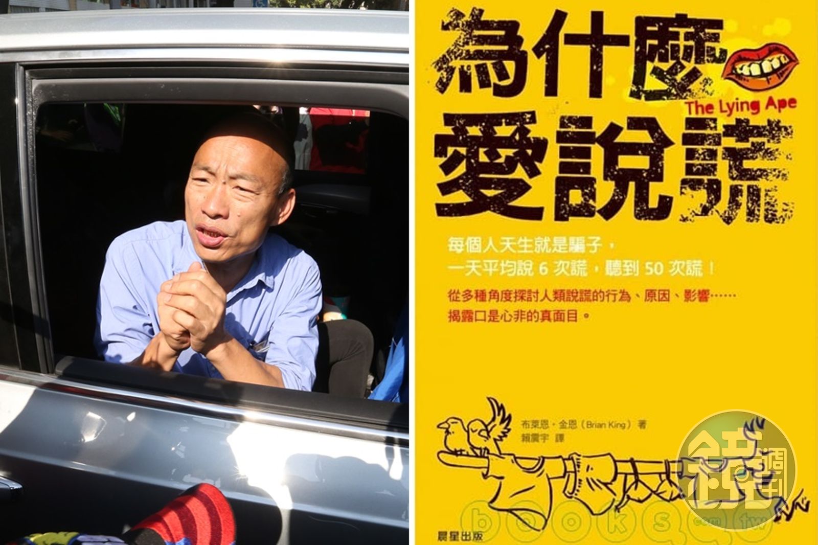 高雄市長韓國瑜昨(25日)到新莊高中與模範學生及優秀畢業生合影,結果一名雄中學生拿出《為什麼愛說謊》書籍合照,嘲諷意味十足,引起網路熱議。不少網友到博客來網站找這本書,卻發現已經買不到,大感失望,博客來臉書粉專也搭上這股熱潮,不但PO文致歉,還誠意十足地附上「說謊」相關書籍。
