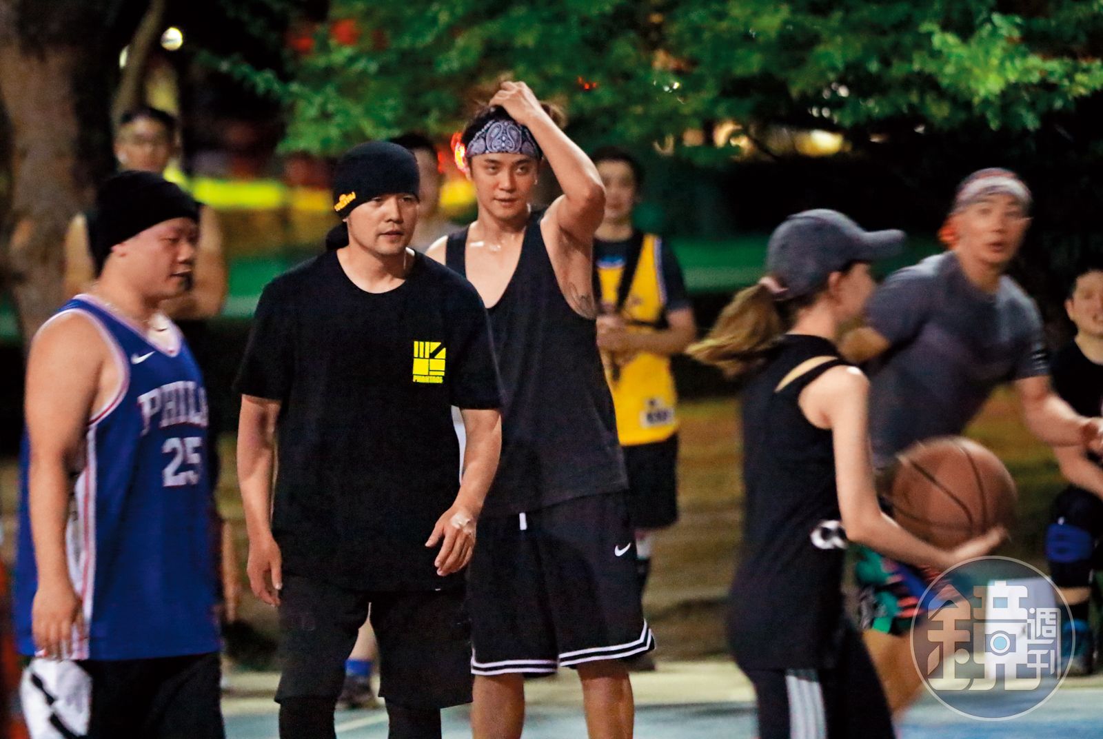 6/19 22:59,羅志祥(左)一下場擦完汗,連忙拿手機當鏡子整理儀容,身旁的周揚青(左二)默默陪著他。6月19日晚上,台北大安森林公園籃球場上星光熠熠,周杰倫與羅志祥在悶熱的夜晚,與好友們揮汗運動,或許是天氣太熱影響球技,周董投籃的準度不如過往厲害,精力無窮的小豬則勇於三步上籃,展現絕佳跳躍力。