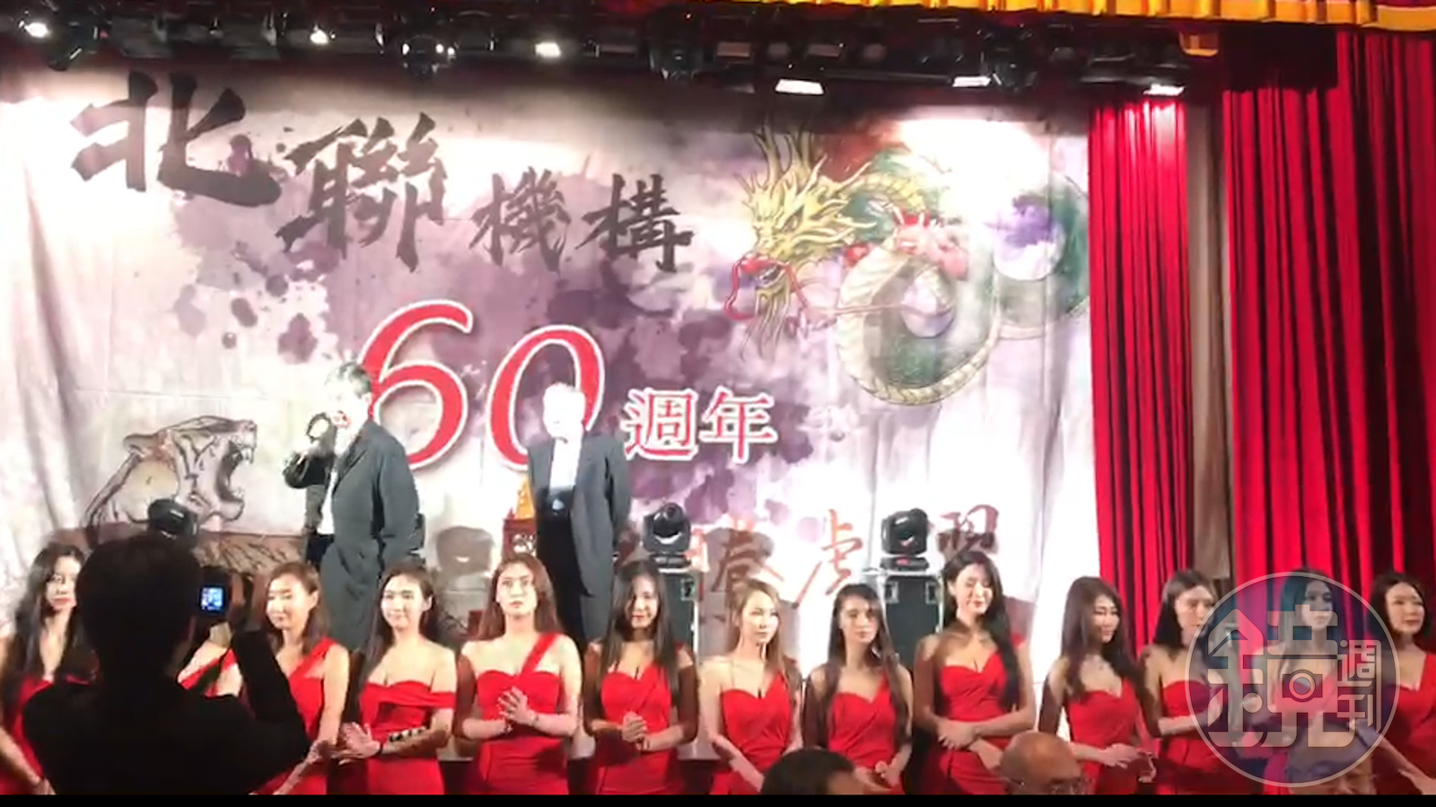 24日晚間六點半,台北市圓山飯店出現不少黑衣人,聚集在飯店門口,並有身穿紅色連身裙的迎賓女子一字排開,在場迎接乘坐黑頭車的重量級人物,原來現場是北聯幫60週年幫慶,發出邀請函在飯店12樓席開百桌。