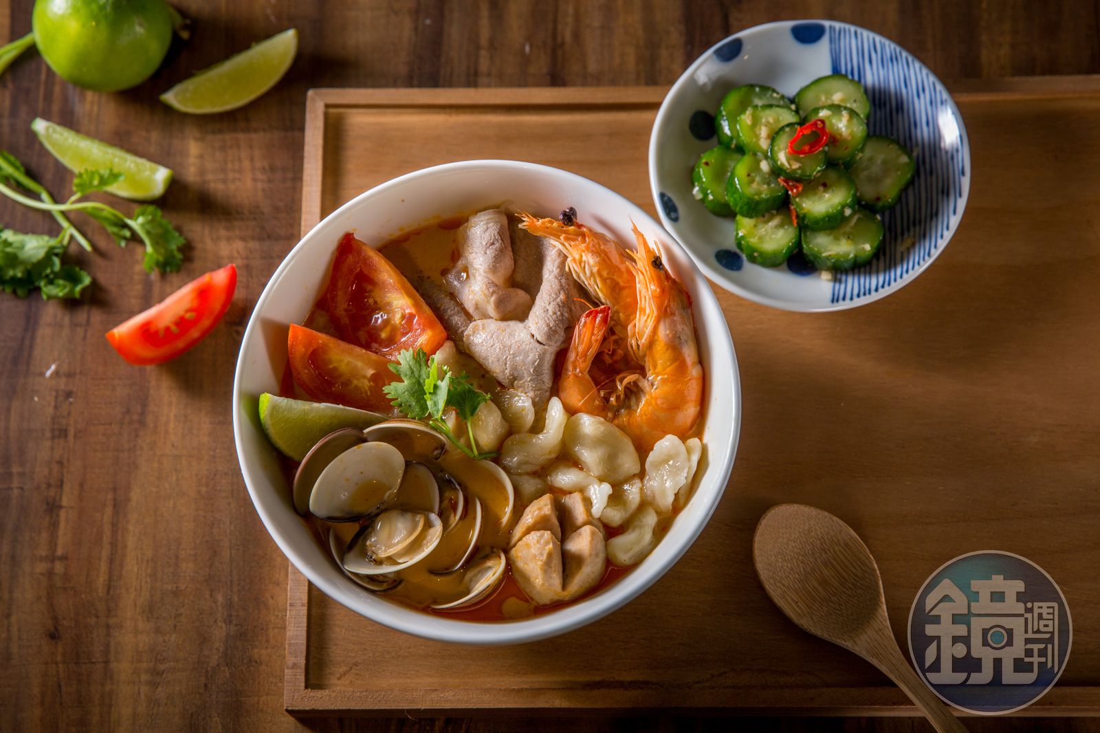 我點了「泰式東央貢海陸麵疙瘩」,加入椰奶的粉橘色湯頭鮮辣柔潤,新鮮番茄、肉片、貢丸、蛤蠣占據碗面,填滿配料空隙的麵疙瘩,比我想得小巧,湯匙沒入湯裡再拉起,輕鬆將麵疙瘩和湯一起收進匙面,湊近嘴邊,一吸就呼嚕滑入,和以往麵疙瘩總在入口前一刻,頑皮脫逃噗通掉進湯裡,濺起深水炸彈的可怕經驗大相逕庭,在這裡吃麵很優雅、很可以。