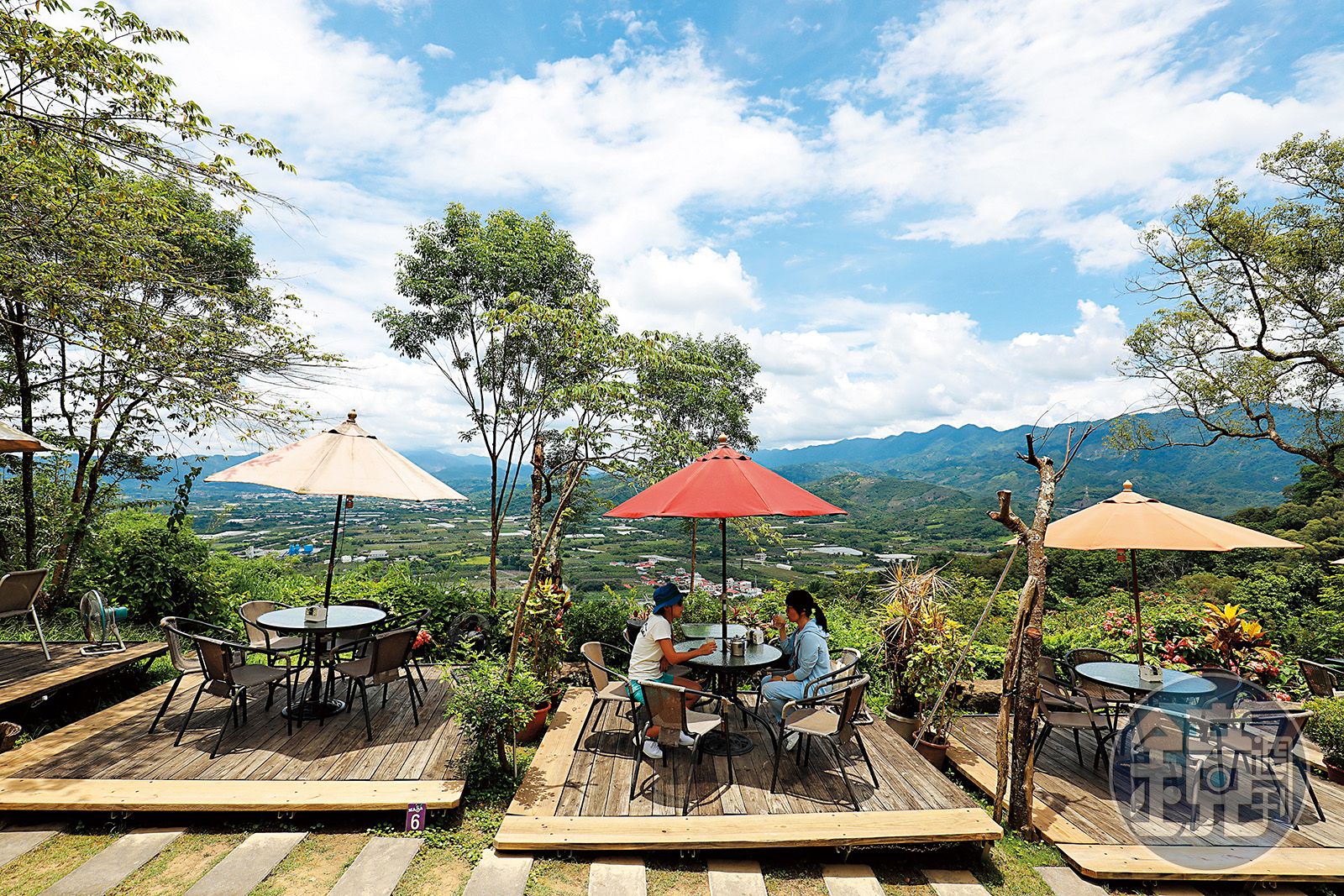 從大門走進去,有一整排沿山坡而建的木棧平台,我自己最喜歡平台上的露天咖啡座,在這邊不只能將阿里山山脈與玉井平原的風光盡收眼底,還能點一杯吃得到新鮮果肉的「芒果啤酒」,或口感綿密的「芒果煉乳冰沙」,在盛夏酷暑之際找到讓人幸福又滿足的滋味。