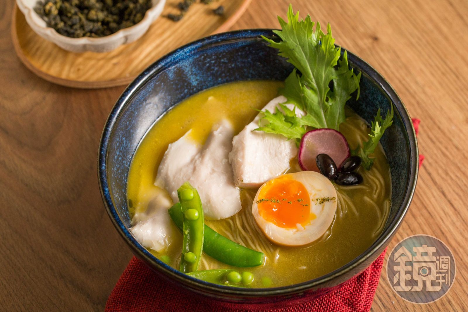 自嘲自己缺乏注意力,「無法重複做一樣的事,看同樣的食材太久,會很膩」的Semi,唯一的治癒方法,便是想盡辦法創作非主流系拉麵,別以為創意拉麵暗藏地雷,「阿里山茶香雞湯拉麵」來到我面前,鼻尖湊近碗邊,茶香飄逸,雞湯底加入大量阿里山金萱茶熬煮,挾起掛上湯汁的麵條,奶香、茶香交織,茶味在嚼麵的中段緩緩湧出,後韻微苦,撒上細緻金萱茶葉粉的溏心蛋,清香甜滑,茶味十足有感。