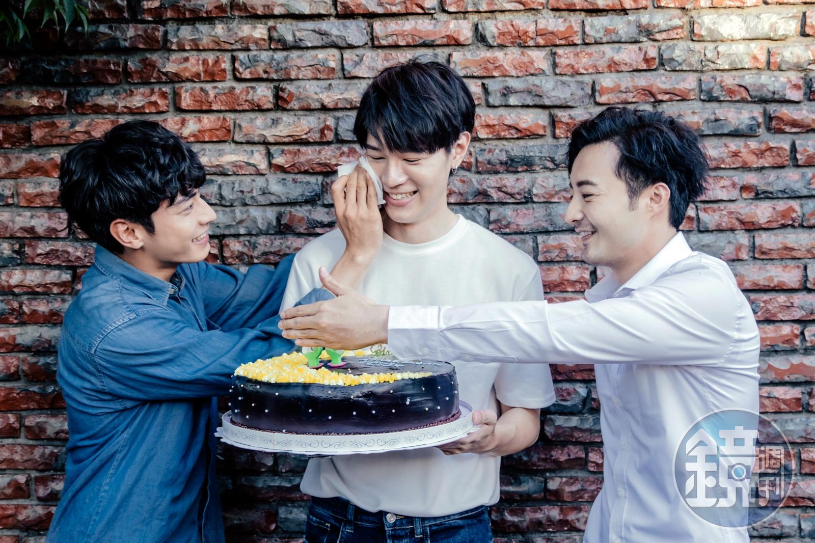 吳珝陽成為新生代人氣小生,還有粉絲送上生日禮物。(歐銻銻娛樂提供)吳珝陽閉眼許第3個願望時,還被林映唯抹了奶油,宋柏緯看見吳珝陽臉上有奶油,貼心的拿出衛生紙,為昔日情人擦拭臉頰上的奶油,兩人的甜蜜舉動讓現場尖叫聲連連。
