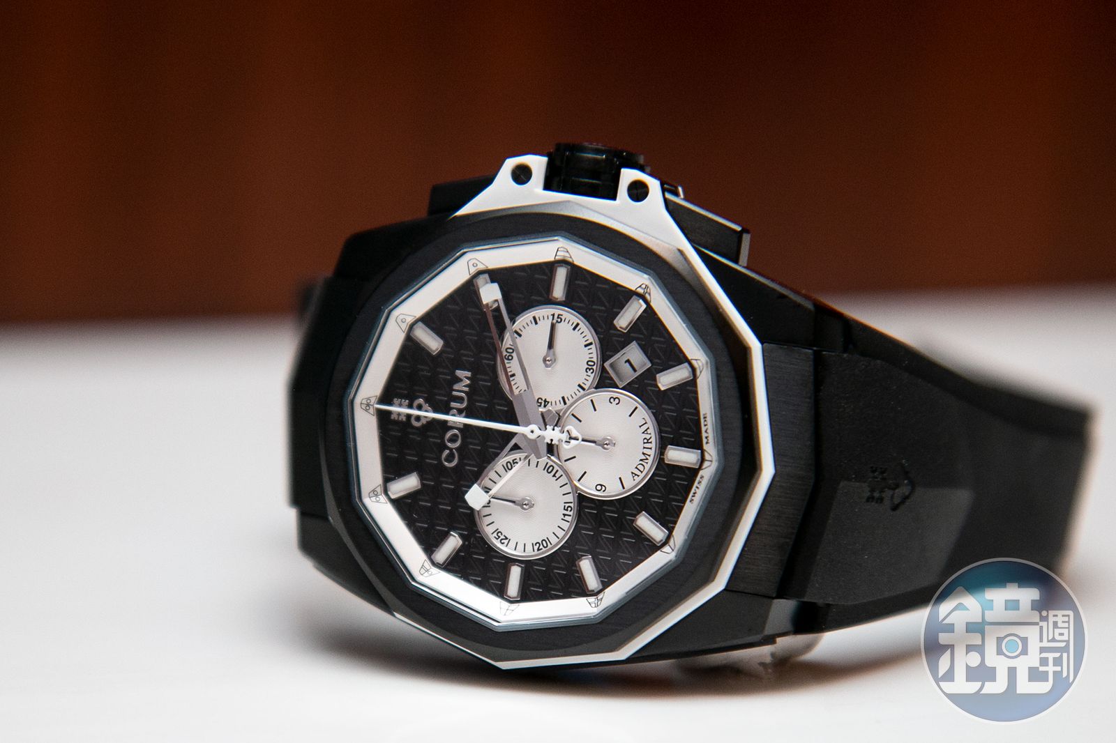 回到這款海軍上將Admiral 45計時碼錶熊貓面版本,它有熊貓面跟逆熊貓面兩種選擇,皆為鈦金屬錶殼,不過後者在錶殼上還加入黑化處理;面盤上還裝飾上格紋,整體層次感很豐富,而且也因為熊貓面的設計讓閱讀上更方便。至於招牌的海事旗則做在面盤外緣,在兼顧面盤的閱讀性之外,還是把經典的元素放上去了。本來我以為45mm的尺寸戴在手上會很大一塊,但有趣的是,或許是因為它的多邊形設計有修飾的效果,視覺上反而沒有太過突兀的感覺,橡膠錶帶配摺疊扣也很好戴,正裝可能不太適合,但算是一款稱職的休閒運動款。