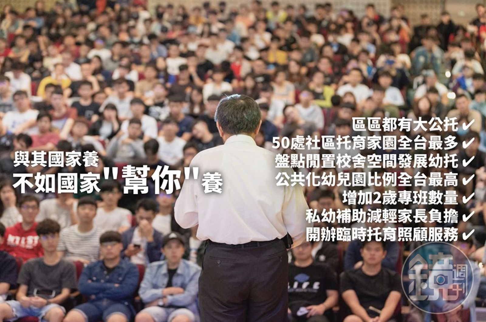 他表示,要完全「國家養」不大可能,「國家幫你養」還比較有可能,這也是台北市政府這幾年努力的方向。包括北市已布建了20處的「大公托」(公辦民營托嬰中心),以及50處的「小家園」(社區公共托育家園),小家園透過4個托育員照顧12個小孩的模式,讓父母可以安心把0到2歲的小孩交給他們照顧,這個模式在台北市率先實驗成功後,現在也擴展到其他縣市。