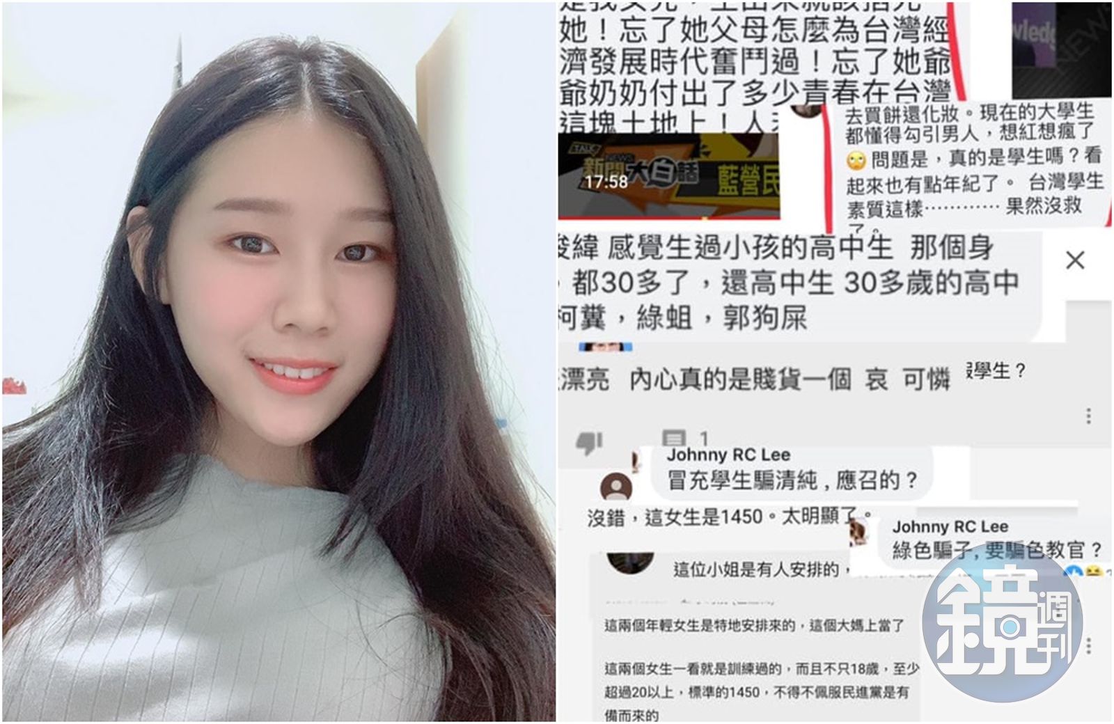 該女學生昨(9日)在臉書發文,貼出韓粉這幾日在她的社群媒體留下的不堪言詞和辱罵,表示「說我假高中生/應召女/演員/設陷阱等傻子上鈎/欺負發瘋的人…………到底什麼才是真的,我看只有韓粉看到的才是真,別人看到的都是瞎,我不看藍綠,只看會不會做事。」她也貼出自己的身分證照片,證明自己真的只有18歲。