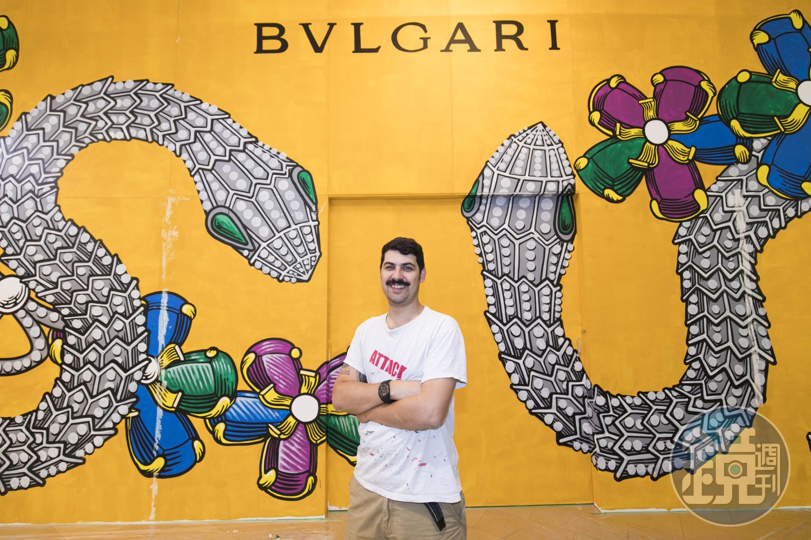 Luca Maleonte以大膽又細膩的筆觸風格詮釋Serpenti 、Fiorever八辦花以及Mediterranean Eden 彩寶花朵等品牌經典符號。他笑說「和寶格麗合作是一件充滿色彩的事,我使用的顏色是跟其他作品相比,前所未有的豐富。」兩造合作始於2015年,當時Luca Maleonte替寶格麗的聖誕櫥窗操刀,將品牌經典的B.zero1、Divas’ Dream和Serpenti等圖騰融合星座概念,打造寶格麗星系。並於2016年曾為羅馬康多提大道總店的櫥窗以花卉為主題創作塗鴉藝術,而之後也先後為米蘭Via Montenapoleone精品店與香港Lee Garden精品店的改裝圍籬進行藝術創作。每次為寶格麗創作幾乎都有Serpenti元素,他也坦言Serpenti 是他最喜的品牌符號:「我最愛寶格麗的Serpenti,我在各個地方都繪畫了它。Serpenti是個很強烈的形象,繪畫大型的Serpenti會展現出一種律動的生命張力,效果很好。」