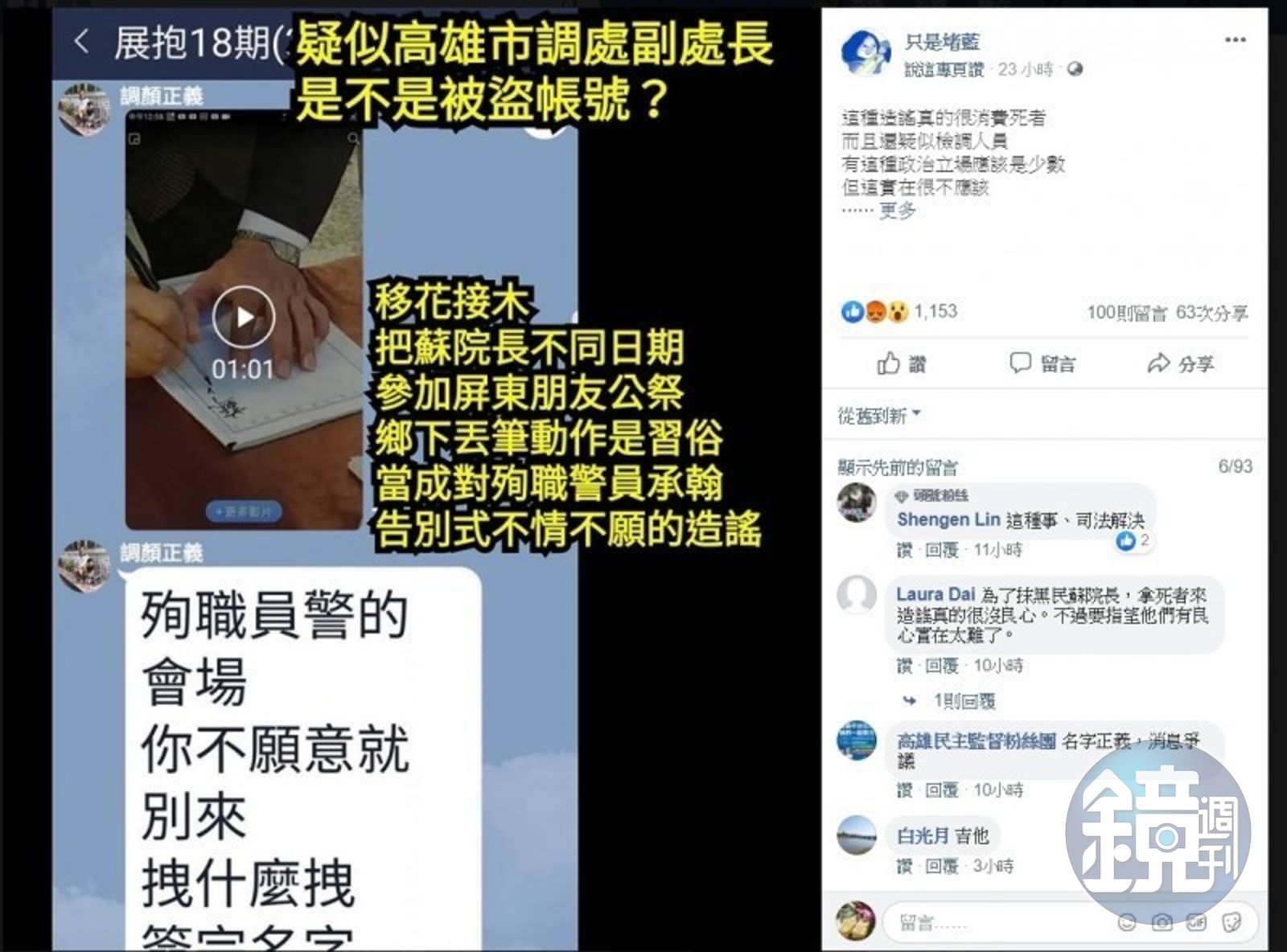 政院人士指出,蘇揆被移花接木的摔筆葬禮影片,一個下午就在警察跟調查局系統廣為流傳,來源又是跟警調人員互動最密切的葬儀社,被有系統的斷章取義抹黑後,迅速在調查局跟警察系統傳開,速度之快令人咋舌,難怪政府高層一再呼籲要打擊假新聞都不見成效,因為原應是查察假新聞的主力,自己就在散播假新聞。