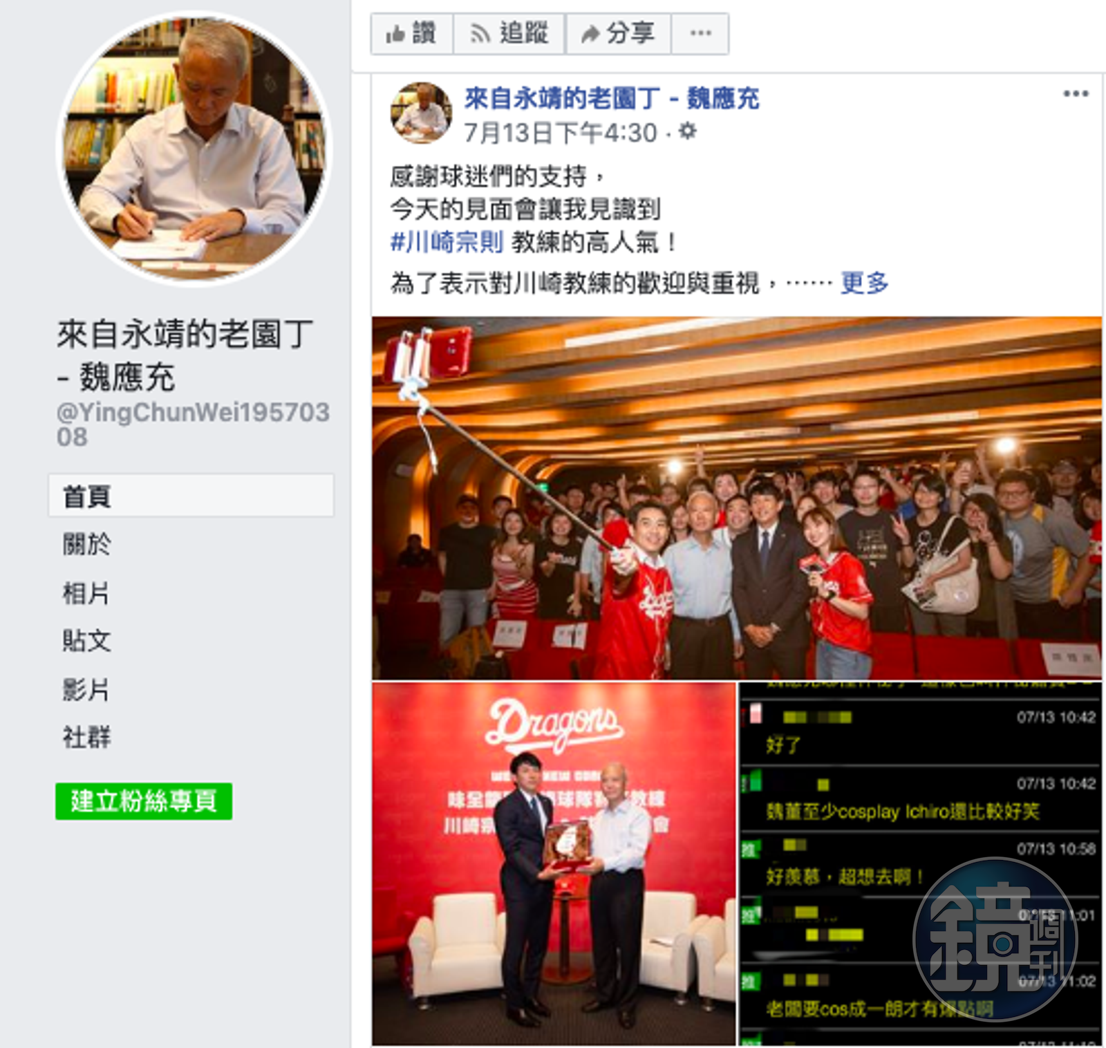 頂新國際集團三董魏應充身為味全龍推手,也以神秘嘉賓身份到場,致贈川崎宗則特製的味全龍瓷繪盤,遭PTT鄉民酸「魏應充哪裡神秘了,這樣也算神秘嘉賓」、「魏董至少cosplay Ichiro還比較好笑」、「老闆要cos成一朗才有爆點啊」。而魏應充也在臉書「來自永靖的老園丁-魏應充」粉絲專頁貼出PTT截圖並幽默回應:「謝謝大家建議我cos一朗」。
