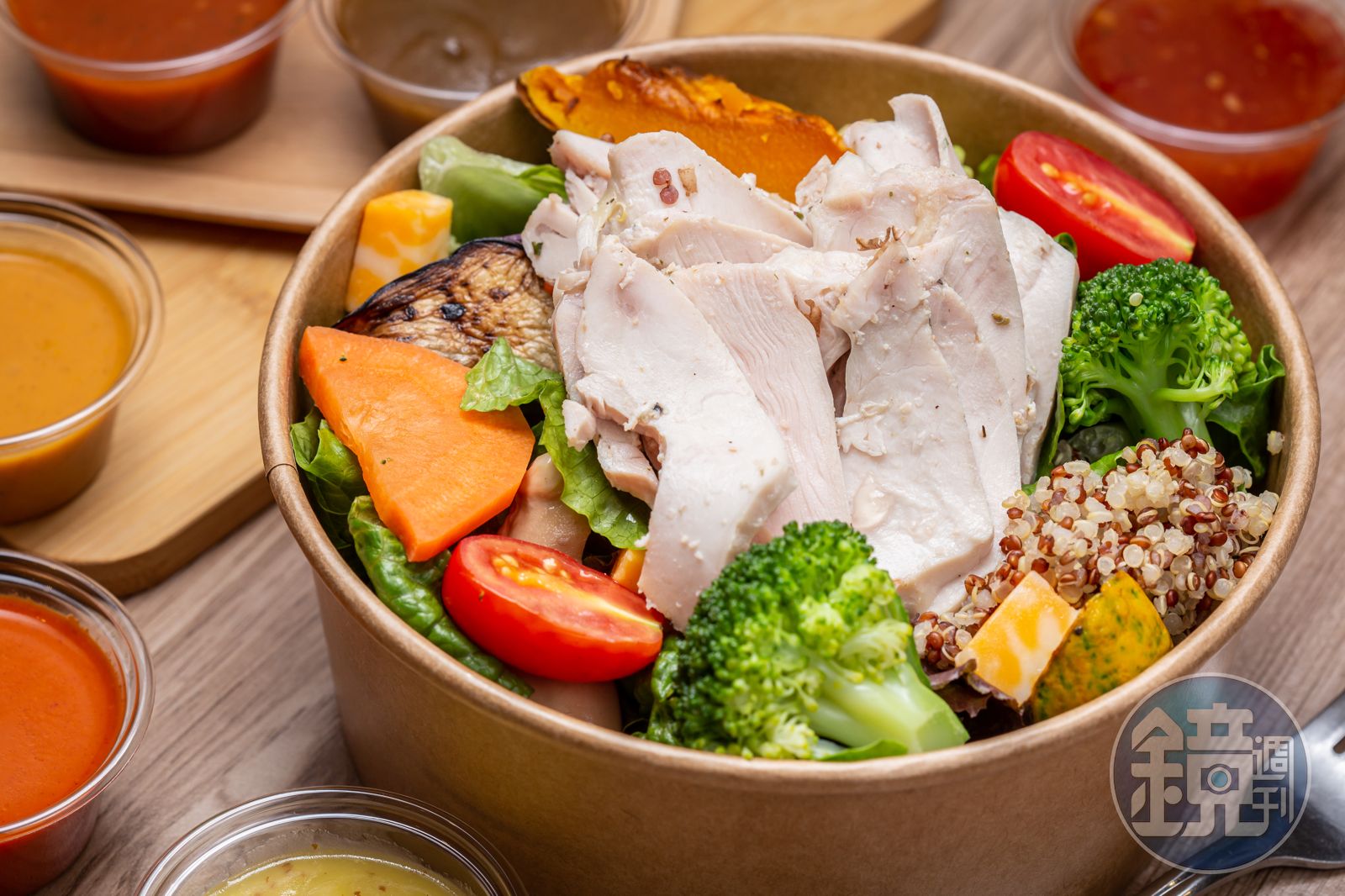 天氣熱沒胃口,「雞肉沙拉」是不錯的選擇,多種生菜蔬果,還有紅藜、堅果和起司丁增添口感和香氣,6款醬汁可擇一搭配,包含南洋咖哩、泰式酸甜、義式番茄、蜂蜜檸檬、紅酒油醋、韓式辣醬。