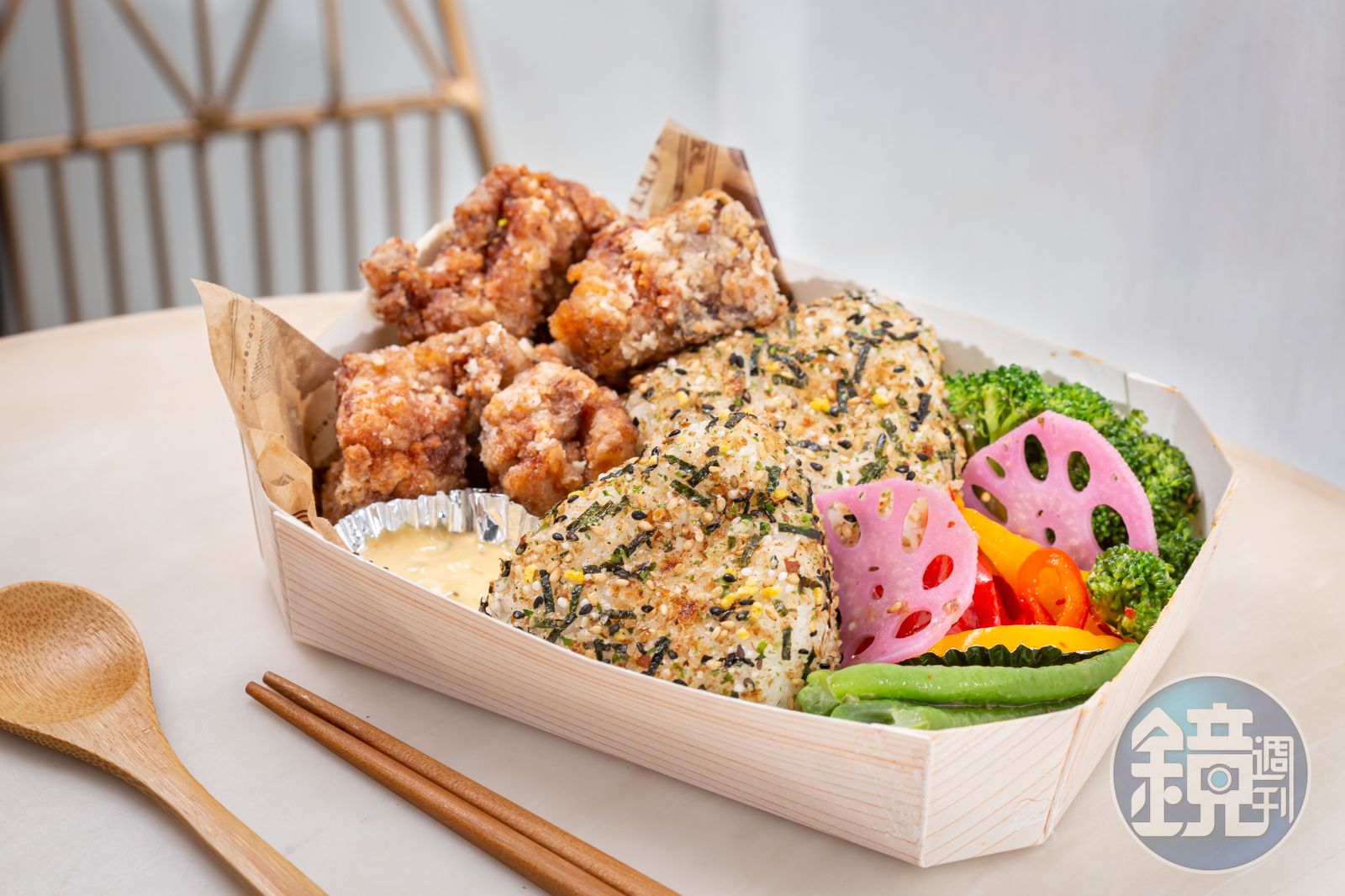 為了做出獨特性,老闆Wing和妹妹Sandy堅持手作料理,不用市售的現成食材。像是「炸雞飯糰」都是一顆顆手工捏製,飯糰外裹著一層香鬆粉,有柴魚和海苔的鹹香,米粒口感軟硬適中;炸雞是用當天新鮮雞肉,醃漬後再蘸日本馬鈴薯粉油炸,外皮薄酥、肉嫩入味。配菜大多用水煮,清爽無負擔。