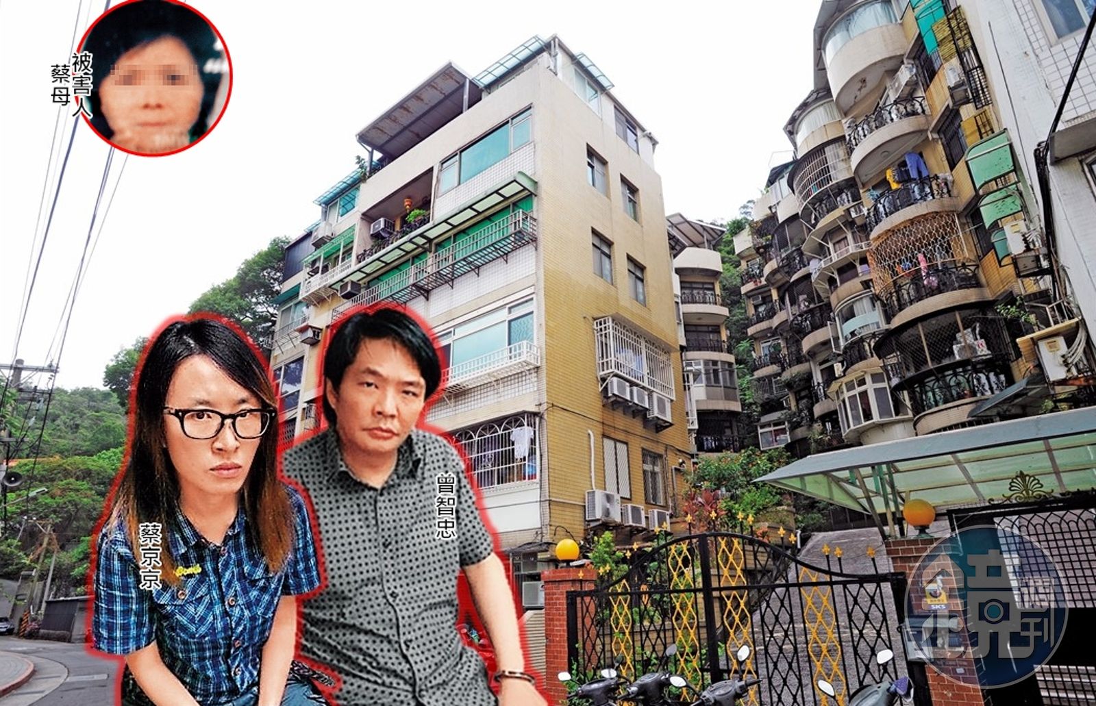 時間回到2012年5月1日,蔡京京、曾智忠帶著電擊棒,進入蔡女父母位在台北市北投的住處,曾男將還在午睡的蔡母電昏,接著以鐵絲纏繞蔡母頸部、膠帶封住口鼻、童軍繩綁住手腳,最後將窒息死亡的蔡母裝進行李箱,隔天載往花蓮棄屍。