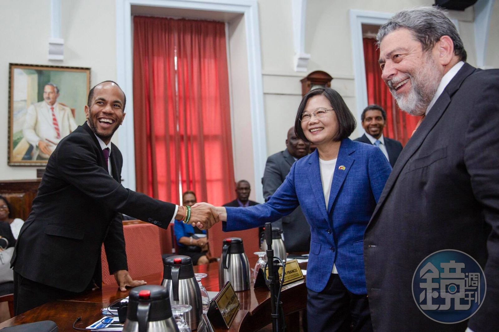 蔡英文今(17)日走訪聖文森時,除了在該國國會發表演講,謝謝龔薩福總理(Ralph Gonsalves)對台灣的支持外,也不忘特地握手感謝布朗部長的力挺。