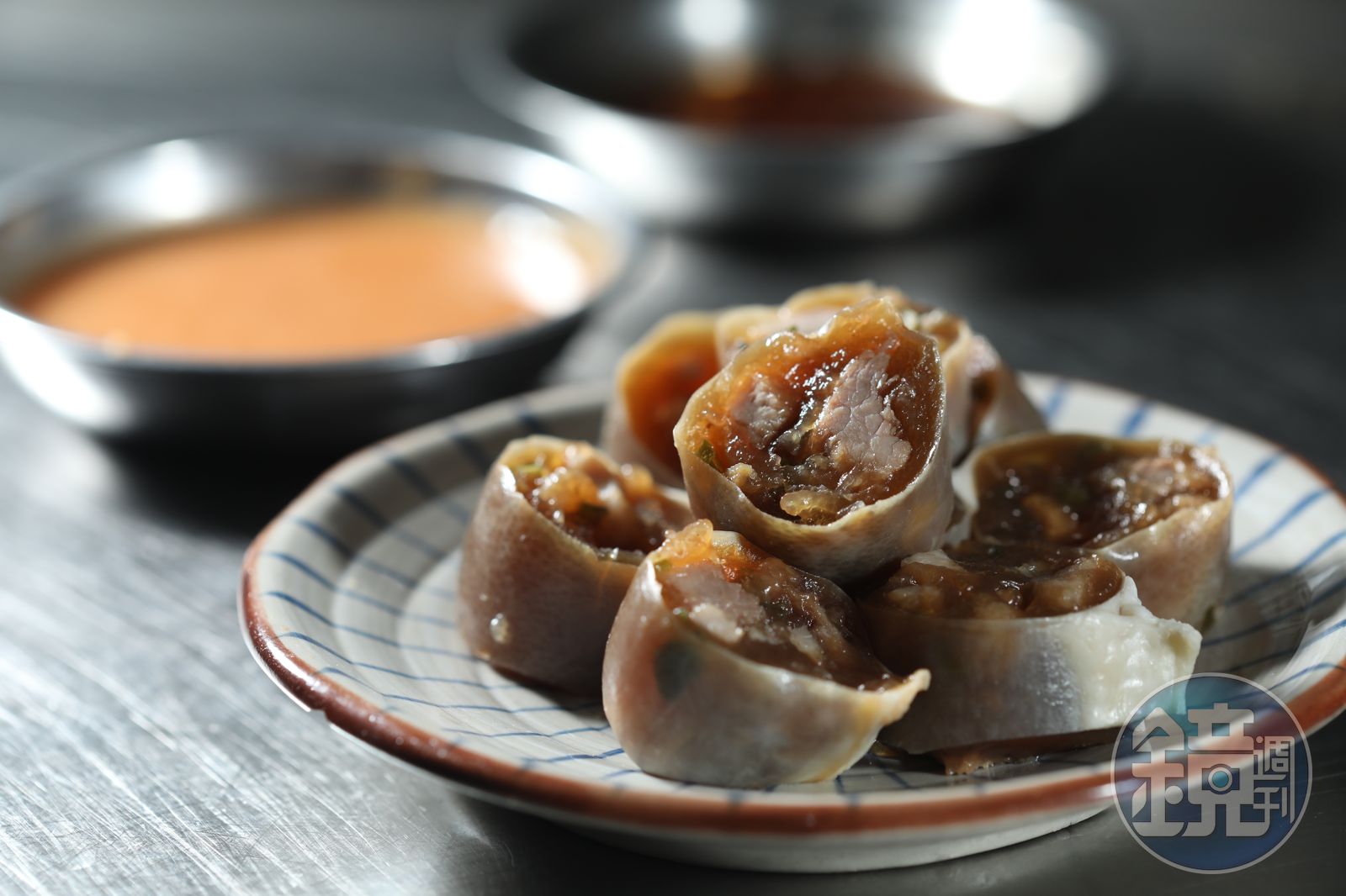 一票黑白切裡,「粉腸」最讓法蘭驚艷,起初吃來不習慣,直到在這裡才找到「軟中帶Q,一吃改觀的口感。」老一輩的宜蘭人很愛,早年物資匱乏時,聰明的宜蘭人想吃肉也想吃飽,於是將地瓜粉裹入豬肉塊、蔥花發想出這道小吃。