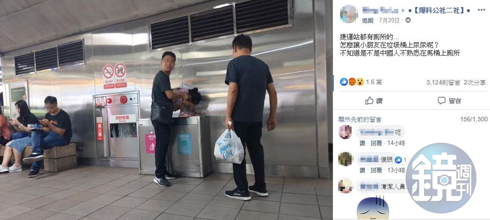 昨(20日)有一名網友在臉書社團《爆廢公社二館》發文,只見照片中一名男子協助一名女童在捷運月台旁的垃圾桶上恣意便溺,男子還不時表情尷尬四處張望,另一名拿著塑膠袋的男子則在一旁把風觀看。該名網友痛批:「怎麼讓小朋友在垃圾桶上尿尿呢?不知道是不是中國人不熟悉在馬桶上廁所。」