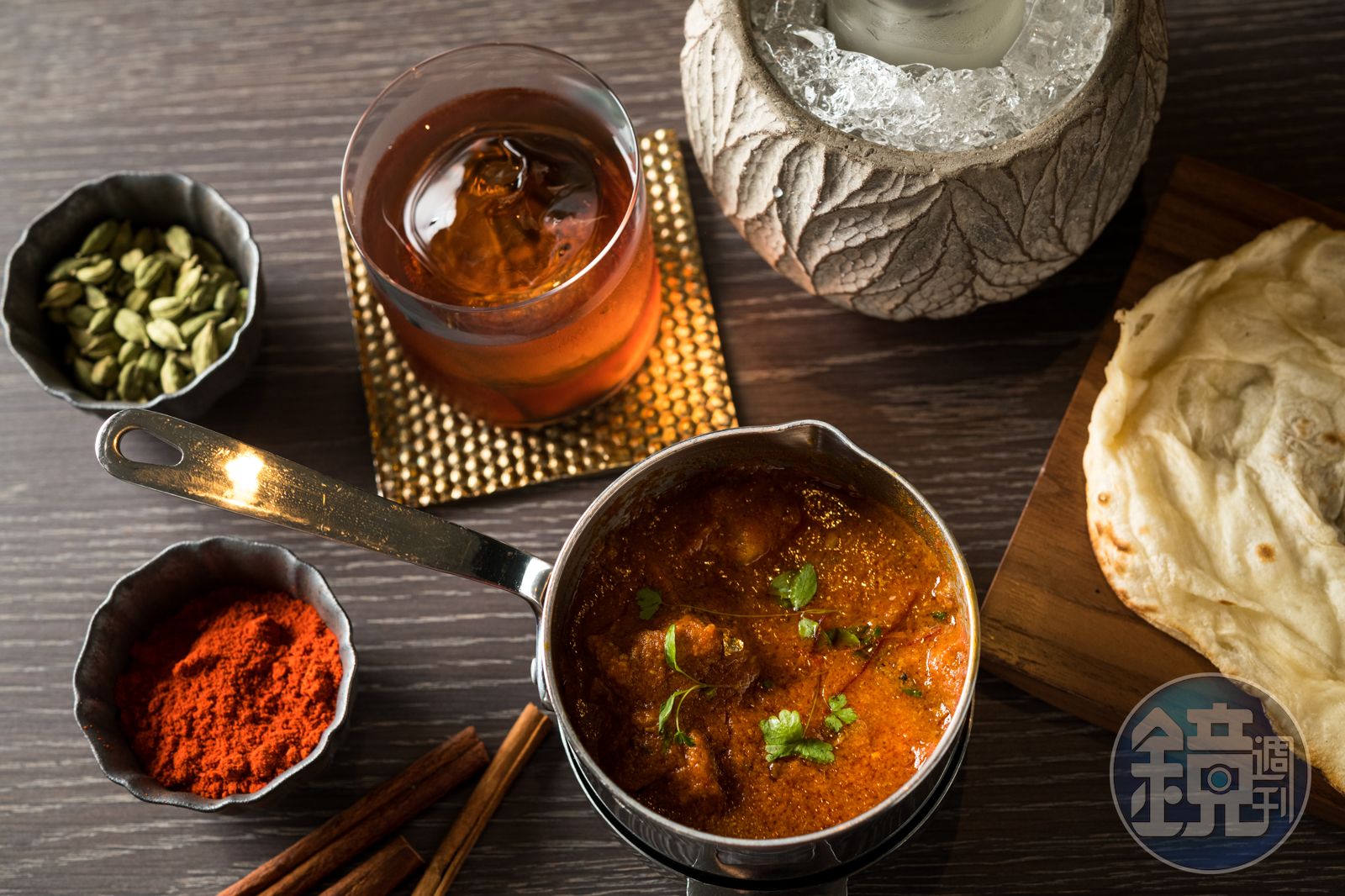 印度的素食人口很多,蔬菜咖哩也是日常料理。「碳烤茄泥咖哩」在茄子、番茄泥裡加了辣椒粉、芫荽粉、新鮮香菜等,亮點在辛辣感,蔬菜泥和辛香料的魅力完全大爆發。Nicolas指出:「不同於其它料理以肉高湯為底,印度菜很擅長運用蔬菜泥裡的旨味,增加菜餚的鮮美。」