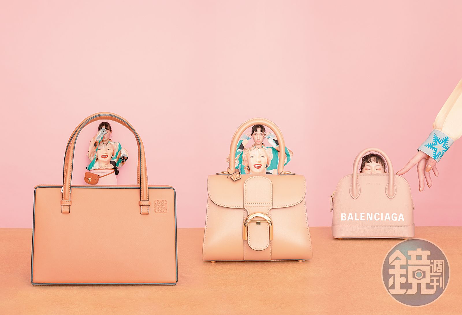(左到右)淺駝色方形手提包 NT$81,000 by LOEWE;粉膚色手提包 價格店洽 by DELVAUX;超迷你奶茶色肩背手提包 NT$53,700 by BALENCIAGA。 (人物)瑪麗蓮夢露襯衫 NT$37,000 by LOEWE;粉色長褲 NT$24,000 by 3.1 PHILLIP LIM;駝色 Pashli mini腰包 NT$17,500 by 3.1 PHILLIP LIM。