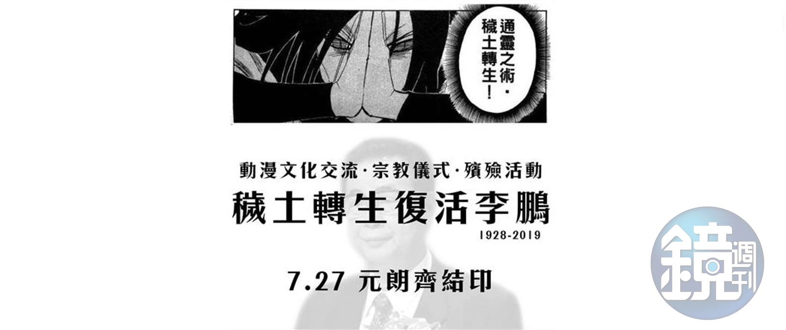 港人鍾健平申請 7 月 27 日「光復元朗」遊行,被香港警方以可能發生嚴重衝突等理遊駁回。擔心無法取得合法遊行權,香港民眾突發奇想,利用〈公安條例〉所列的殯殮例外,將遊行目的改成為日前(22)逝世的前中國總理李鵬追悼會,做圖邀請全香港「愛黨愛國」的人民在 27 日穿著黑衣,前往元朗共襄盛舉。