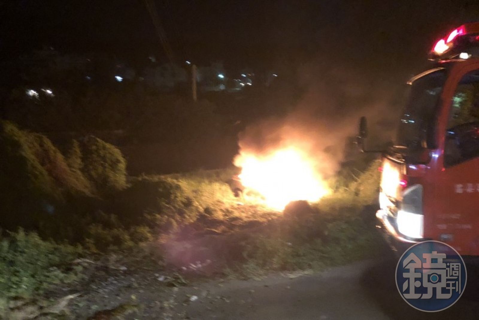 苗栗縣消防局勤務中心是在昨天晚間10點37分接獲報案,指苗栗市英才路往後龍鎮方向路邊,發生火燒車事件,警消趕抵現場,只見三公尺深的駁坎下方空地,熊熊烈焰吞噬整部車子,警消趨前確認車內無人,立刻拉水線灌救,很快撲滅大火。