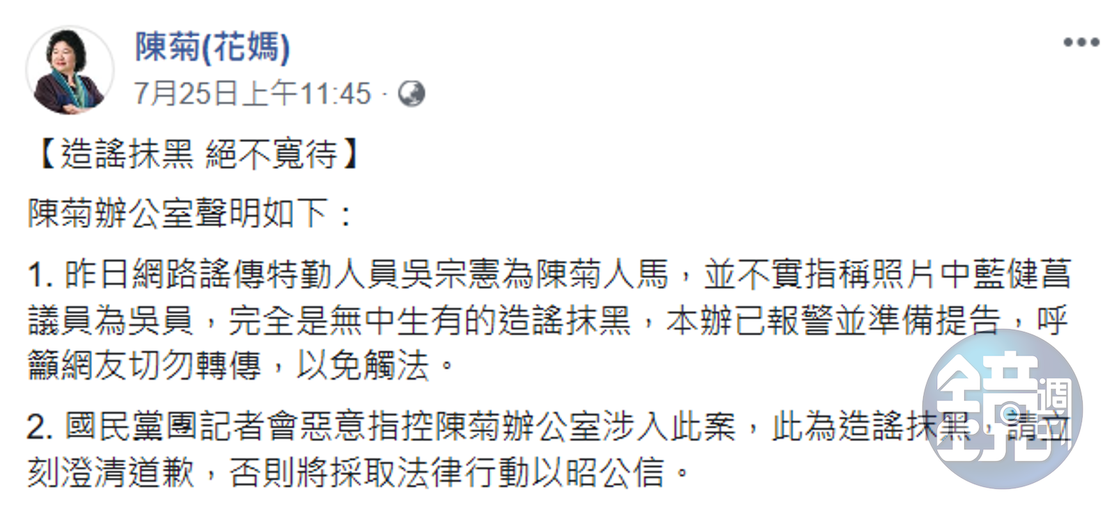 7月24日,有民眾在PTT上發表前高雄市長陳菊與近期走私香菸案的國安局少校吳宗憲曾一起同框的新聞,影射雙方有政治特殊關係;雖然當天就有網友直接更正該消息內容,指出站在陳菊身旁的男子,並非該名國安局吳姓少校,而是前市議員藍健菖,不過該篇假消息已經遭大量轉載、報導。陳菊也認為造謠影響政府公信力、公共秩序,在臉書上發表聲明要求道歉,否則將採取法律行動。