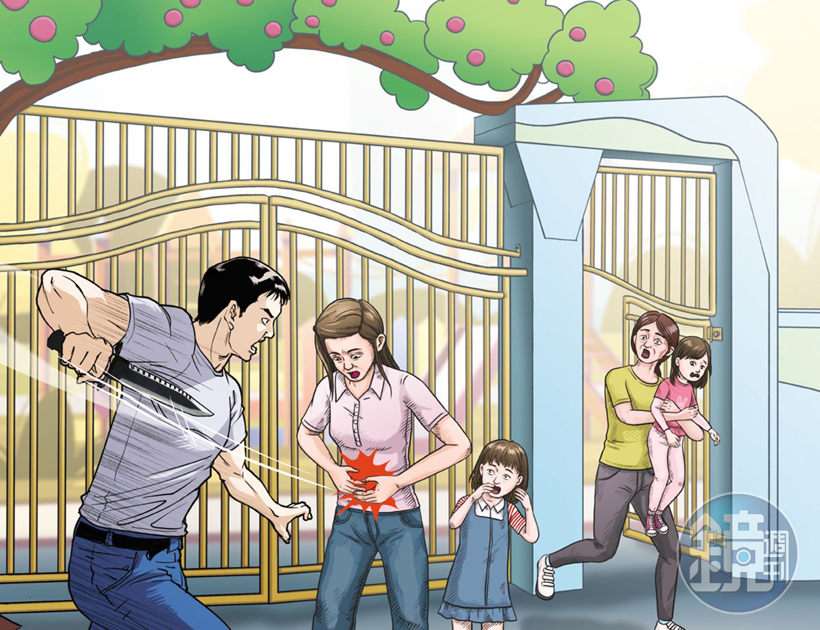 陳女看到前夫持刀朝她衝來,本能反應先將已下車的小女兒抱給老師,並轉身保護尚在身旁的大女兒。李宏基仗著力氣大,把大女兒一把抓到身邊,陳女則奮不顧身抵抗,雙方的舉動嚇壞不少老師、家長和正要上學的小朋友。
