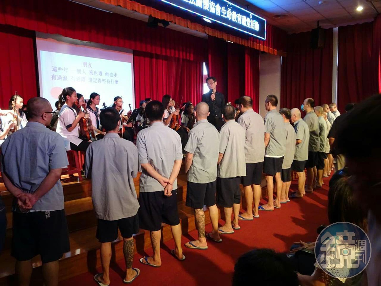 日前高雄市希望弦關懷協會的34名小朋友,受基督教更生團契高雄區會邀請,與創辦人劉哲儒牧師一起背著提琴前往高雄戒治所,用「心事誰人知」「朋友」「愛拚才會贏」等知名歌曲,激勵被視作社會邊緣人的收容人。有10餘名收容人聽完歌曲後受到啟發,自願請在場的牧師給予禱告,悔過重新做人。