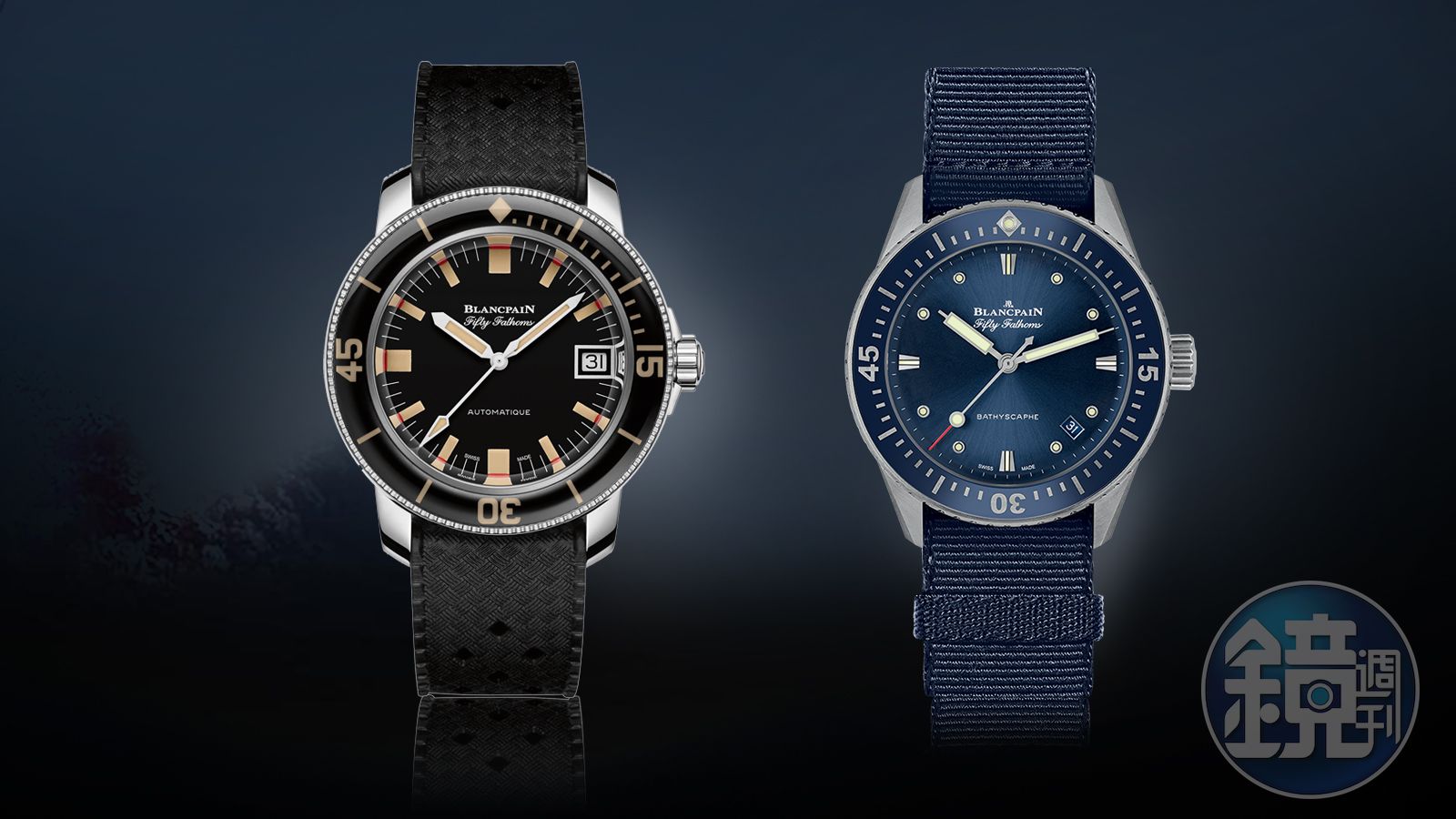 寶珀的五十噚是潛水錶中的經典,後來漸漸發展出不同的功能,每款的樣子雖然看起來略有不同,但具備相同精神的經典錶款定位,這點是不變的。五十噚的尺寸拓展得滿完整,除了38mm之外,40mm、43mm到45mm這個現代運動錶的錶徑主流也都囊括了。以五十噚Automatique來說,尺寸大部分都落在45mm,如果要考慮到女生也可以佩戴的需求,那錶徑40.30mm的這款Barakuda會比較合適。另外一款五十噚的Bathyscaphe,是復刻推出的延伸款,錶徑大致上分為38mm和43mm,如果選擇38mm的尺寸,女生比較可以上手,對於男生來說也還不會顯得過小。40mm的黑面五十噚復刻款Barakuda、配上38mm的藍面Bathyscaphe,以顏色和尺寸來說,情侶交換佩戴是滿可以的。