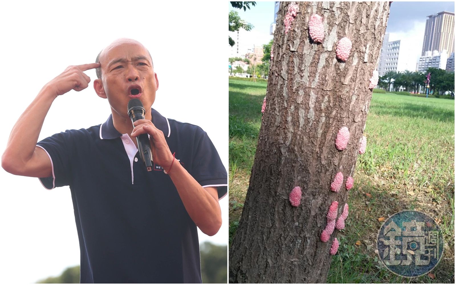 有高雄市民於《公民割草行動》臉書粉專中po文,表示在昨(29)日下午4點時,在凹子底捷運站4號出口附近的公園草地上,拍到樹幹上布滿「粉紅福壽螺卵」,讓他感到不可思議直呼「很難想像這是一個都市的公園草地。」