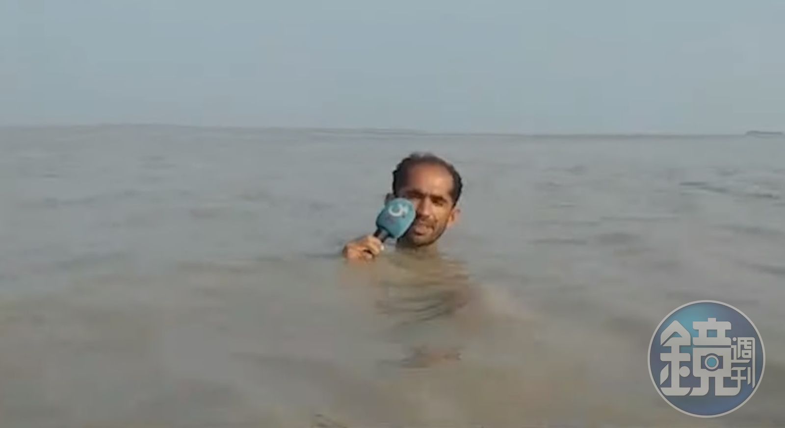 綜合外媒報導,巴基斯坦電視台《GTV》一名記者海珊(Azadar Hussain),日前在報導洪水災情時,整個人浸在泥黃色的洪水中,面不改色地播報新聞,由於水深到只露出一顆頭,他只好將麥克風往上拿以免浸到水。