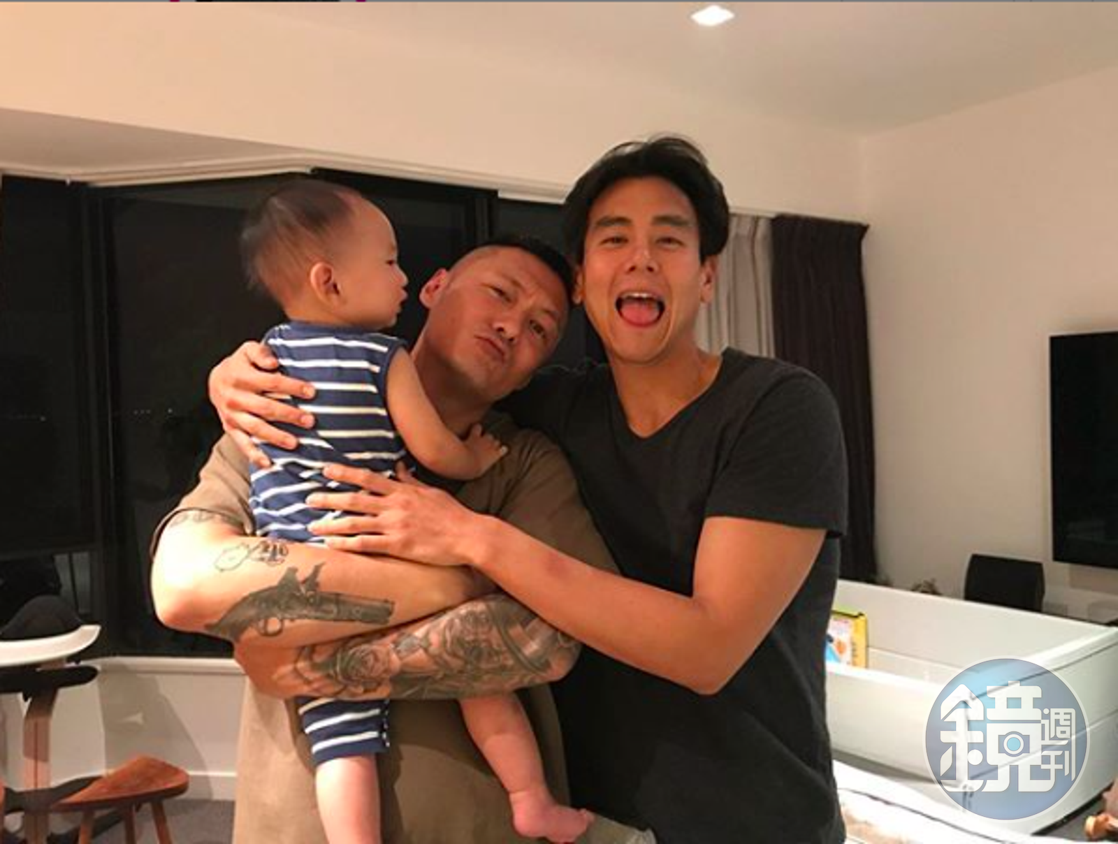 余文樂結婚拍照時,彭于晏也來了,玩得好開,這是另一對隱藏版新人就是了。(翻攝自余文樂IG)余文樂也算是曬兒魔人,跟兒子一起出現的照片都又潮又型。他十七年前因為和彭于晏在台拍《愛情白皮書》而成好友,婚禮時,彭于晏也前來,兩人又打又鬧的,還真像是一對(喂)。