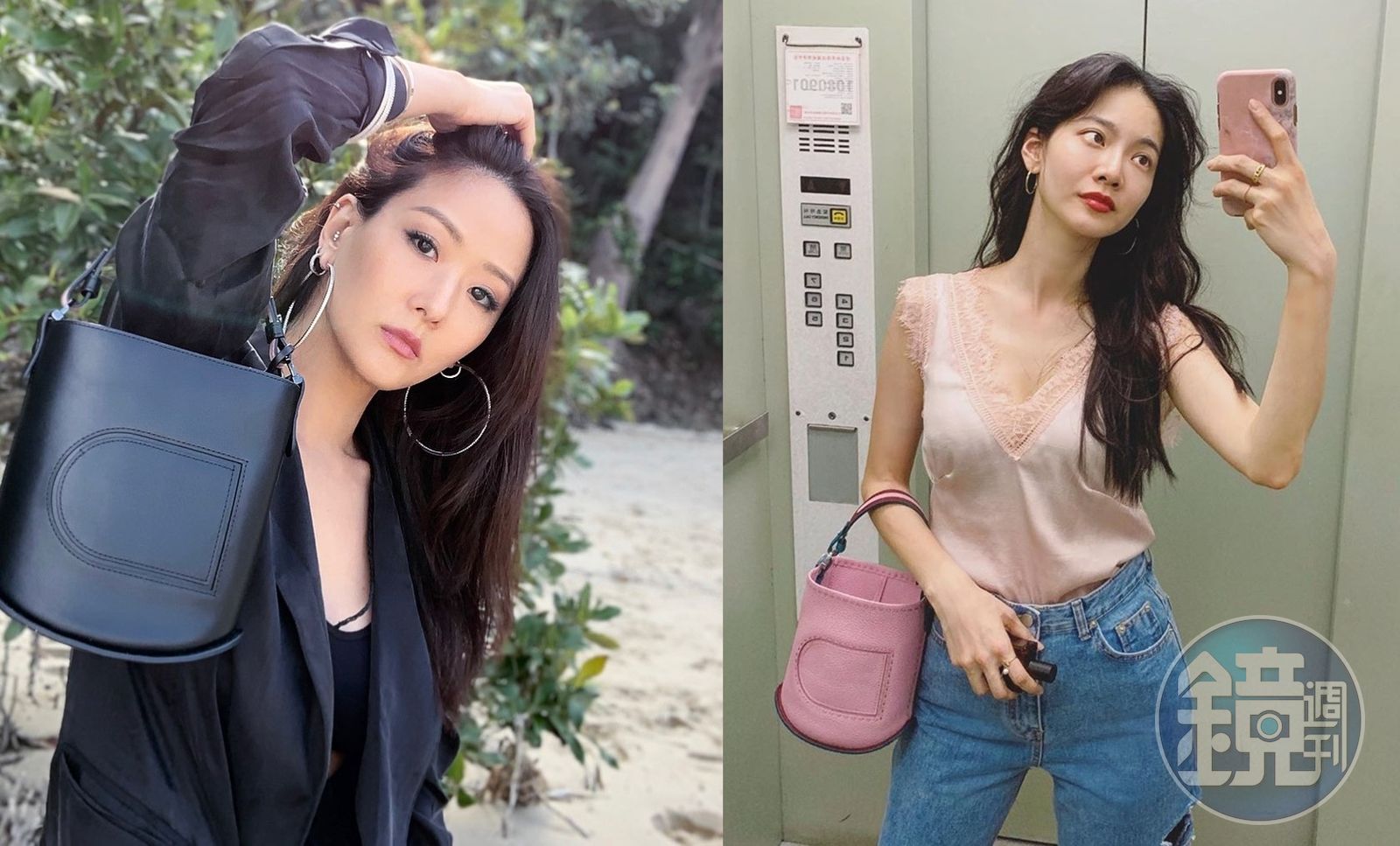 孫芸芸手拎DELVAUX Pin系列黑色光滑牛皮Mini Bucket手拿提袋,NT$79,900;曾之喬的DELVAUX Pin系列胭脂粉Mini Bucket手拿提袋,NT$67,300。(翻攝自孫芸芸、曾之喬IG)發布時間:2019.07.31 15:15 臺北時間