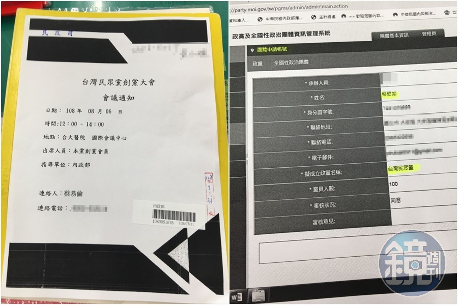 本刊獨家取得內政部的政黨登記文件,台灣民眾黨由柯文哲的心腹蔡壁如擔任政黨申請的登記人,地點設在台北市大安區,創黨日期訂在8月6日,將在柯曾任職的台大醫院國際會議中心召開創黨大會。