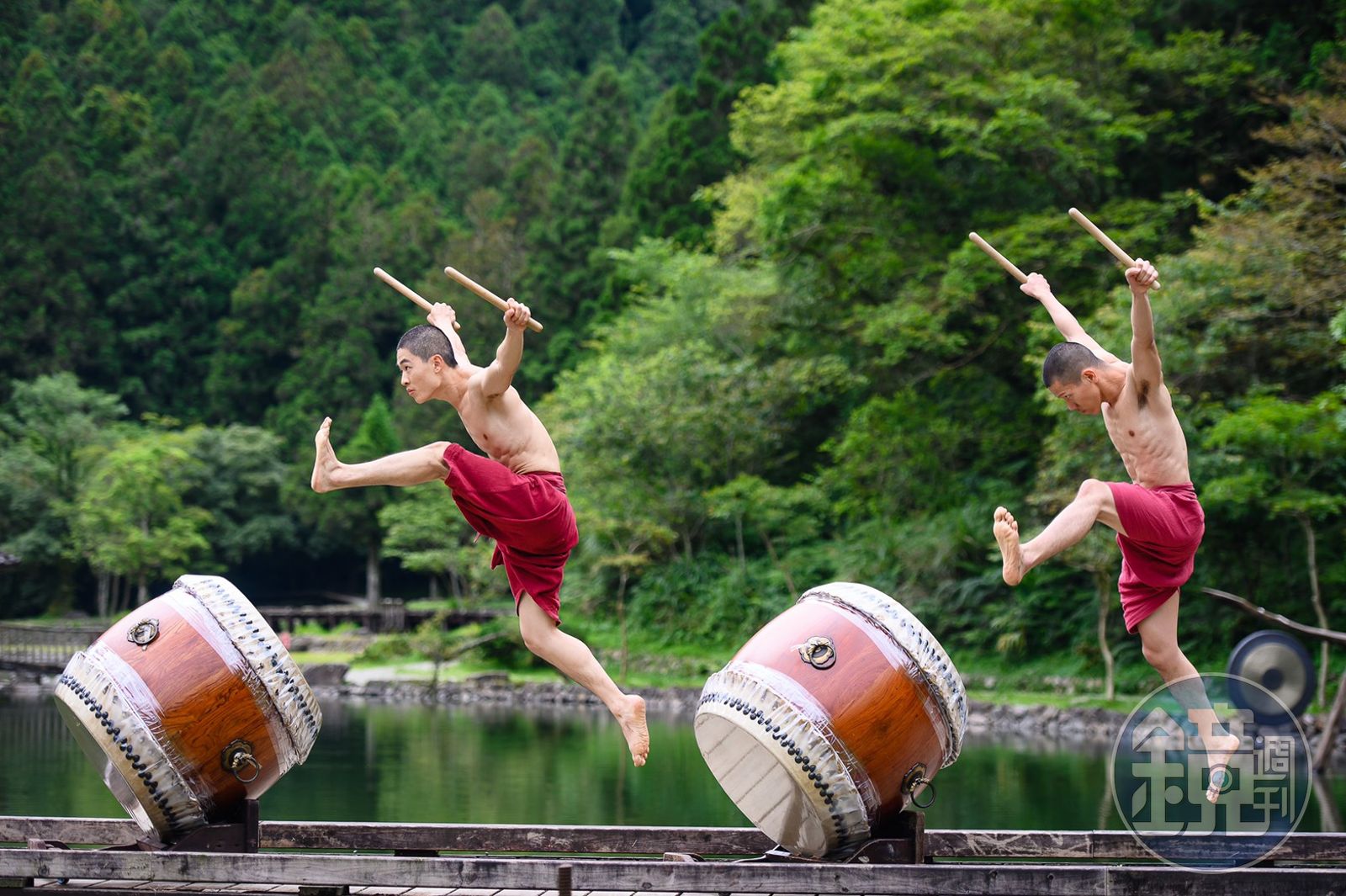 優人神鼓10/25(五)~10/27(日)的演出,將以「水」為主軸貫穿整體創作,運用大神鼓、大銅鑼、大抄鑼架於湖水之上,鼓者以互動的方式融入明池之水,演出「崩」展現大水初來時的洶湧澎湃、「流水」表現緩慢又密集的細小水流、「聽海之心」代表大海深處的寧靜、「沖岩」以彈跳動作象徵海浪撞擊岩石也寓意人生面臨挑戰但確不斷地超越、「海潮音」以寬廣渾厚力量展現清明而深入人心之音,進而升起寧靜的感受。這五個段落在各種節奏與力道變換的鼓聲鑼音下,擬現水不同的狀態,比喻生命中所經歷各種樣貌。