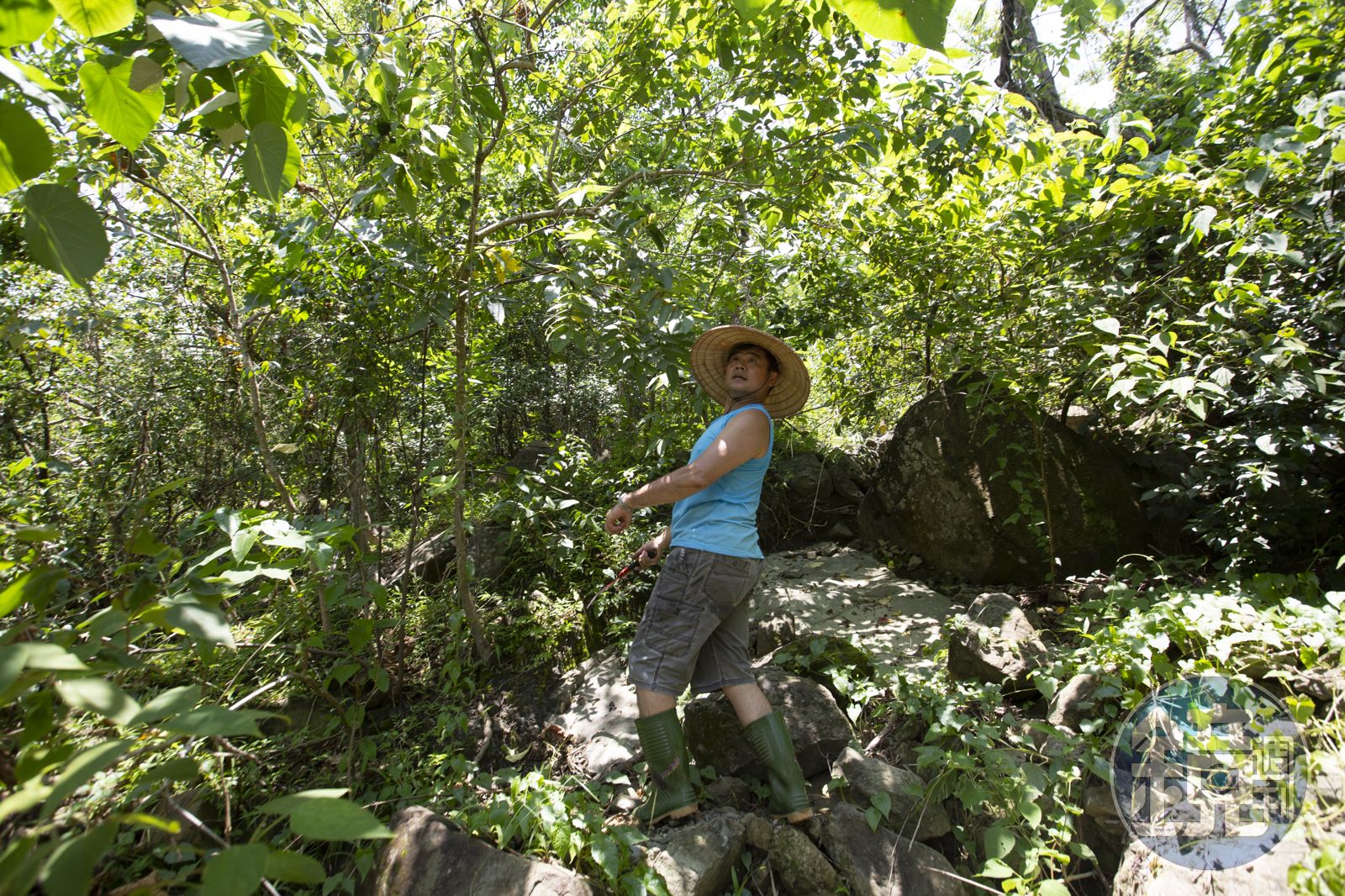 隔天,我們又帶翁瑞琪回去。這次裝備齊全,可以自己開路了,但真是十分艱辛的一趟回家路,沿路砍草和樹枝,爬山跨石,幾經窮途,只見他又揮刀砍出新路,大約20分鐘後,好不容易才抵達了一個點。他說:「大概就是這裡吧。」