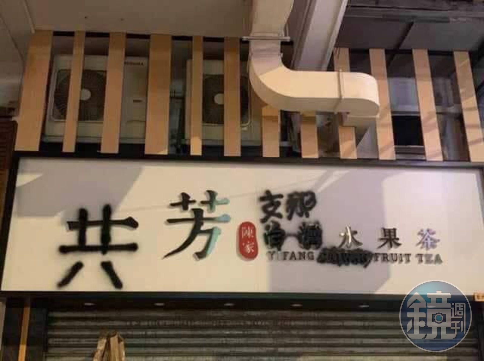 一芳引起台灣及香港網友不滿揚言抵制,香港深水埗分店更直接受到波及,招牌遭香港示威民眾噴漆變成「共芳支那水果茶」。(翻攝自綠黨臉書粉專)發布時間:2019.08.06 11:30 臺北時間