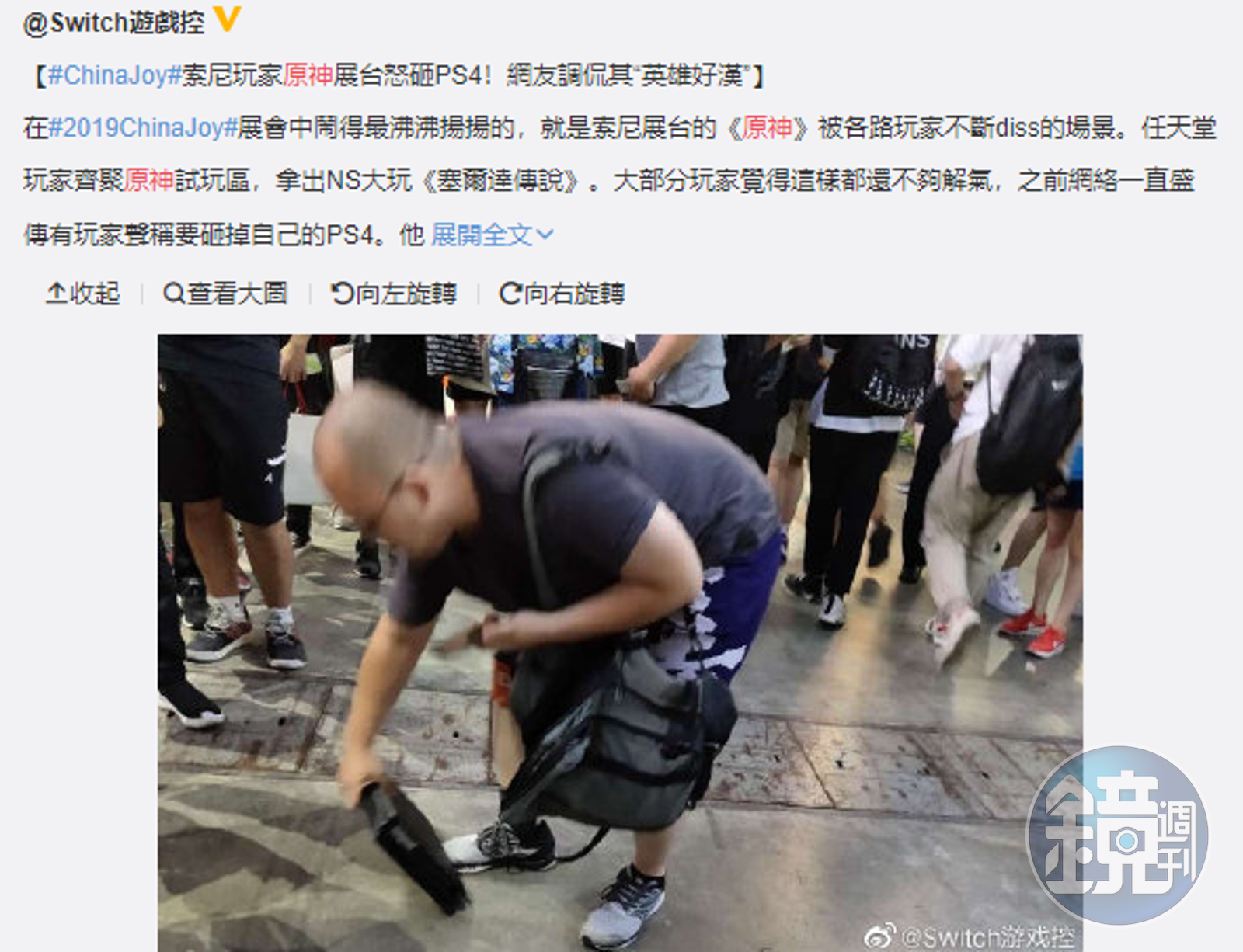 這名將PS4摔到地上的玩家,微博稱號是「我的隊友四條狗、」,他事前就表示,如果索尼真的在會場上展出《原神》,就要到現場砸PS4,當時他氣憤指出,「真他X這種遊戲端出來拿ps4上給全世界看,丟不起這個人,真丟不起,我們大部分還是要臉的好嗎?氣死我了。」後來他果真到ChinaJoy現場,帶著自己收藏多年的PS4主機,一股腦將它砸在地上,並說:「中國遊戲是不會死的,因為它沒有活過。」