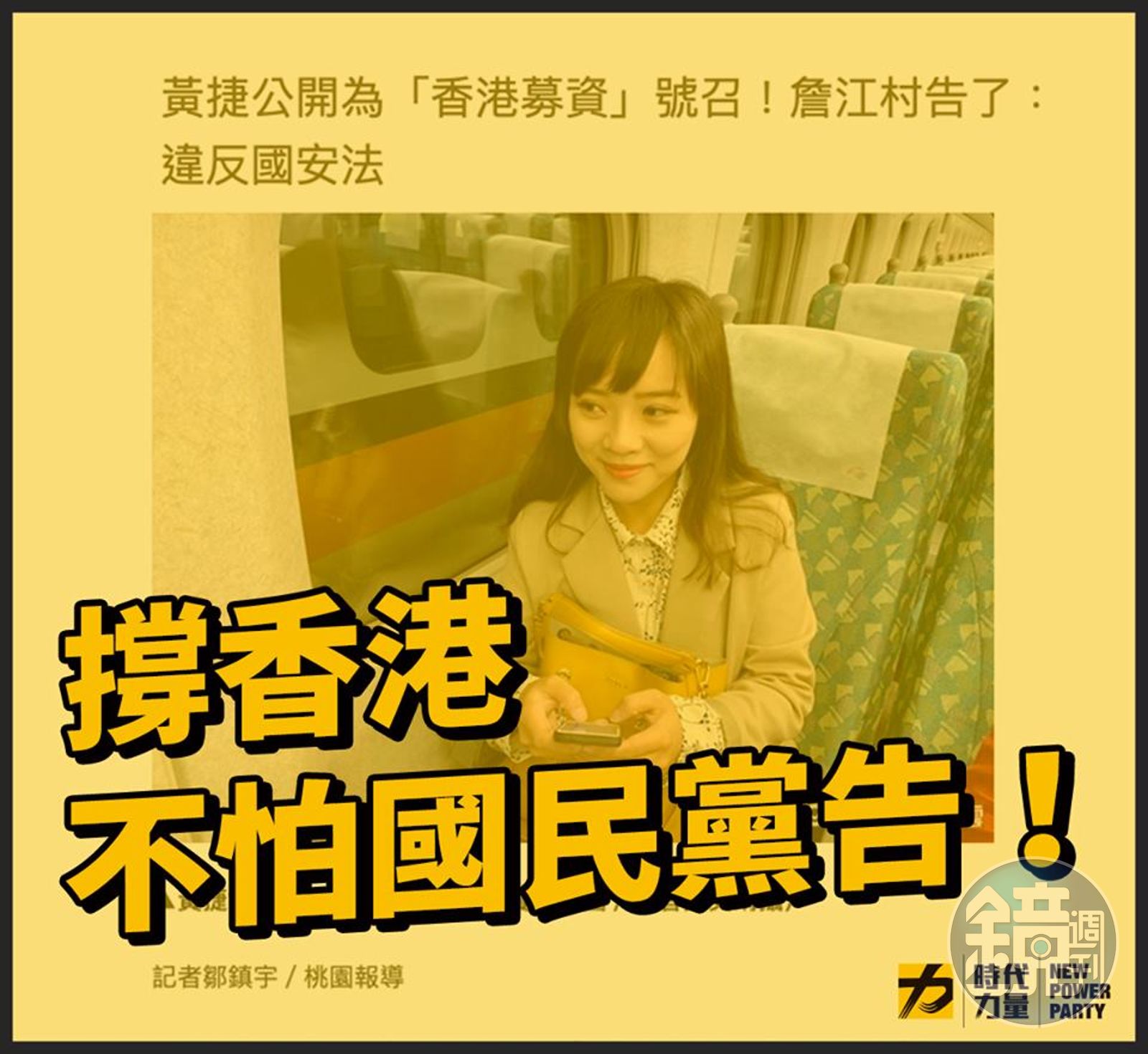 時代力量也解釋,黃捷遭國民黨議員詹江村以國安法2-1條提告,甚至要黃捷「如果那麼愛香港就搬過去,不要領台灣人的錢卻管香港的事,『我來贊助黃捷單程機票去香港,去了就不要再回來』。」