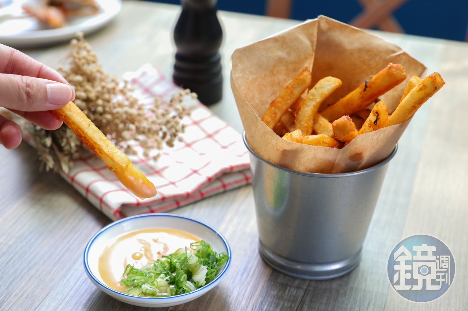 「蒜味薯條沾香蔥雞汁美乃滋」的涮嘴滋味,讓米其林密探連2年在台北米其林指南中推薦它。(130元/份)「自製香料肉腸炒馬祖淡菜」有當令肥美的淡菜和蛤蜊,肉腸的鹹香襯托海鮮甜味。(480元/份)讓我留下深刻印象的還有「蒜味薯條沾香蔥雞汁美乃滋」,特色是一旁的沾醬,嘗一口我馬上聯想到一款零食,蔡斌翰笑說:「就是科學麵。」他以美乃滋為基底,加進雞油、洋蔥粉和蔥花,模仿調味粉包的味道,讓我一根接一根停不下來,涮嘴滋味甚至吸引米其林密探來吃了好多回,更讓餐廳連續2年入選台北米其林指南的餐盤推薦。
