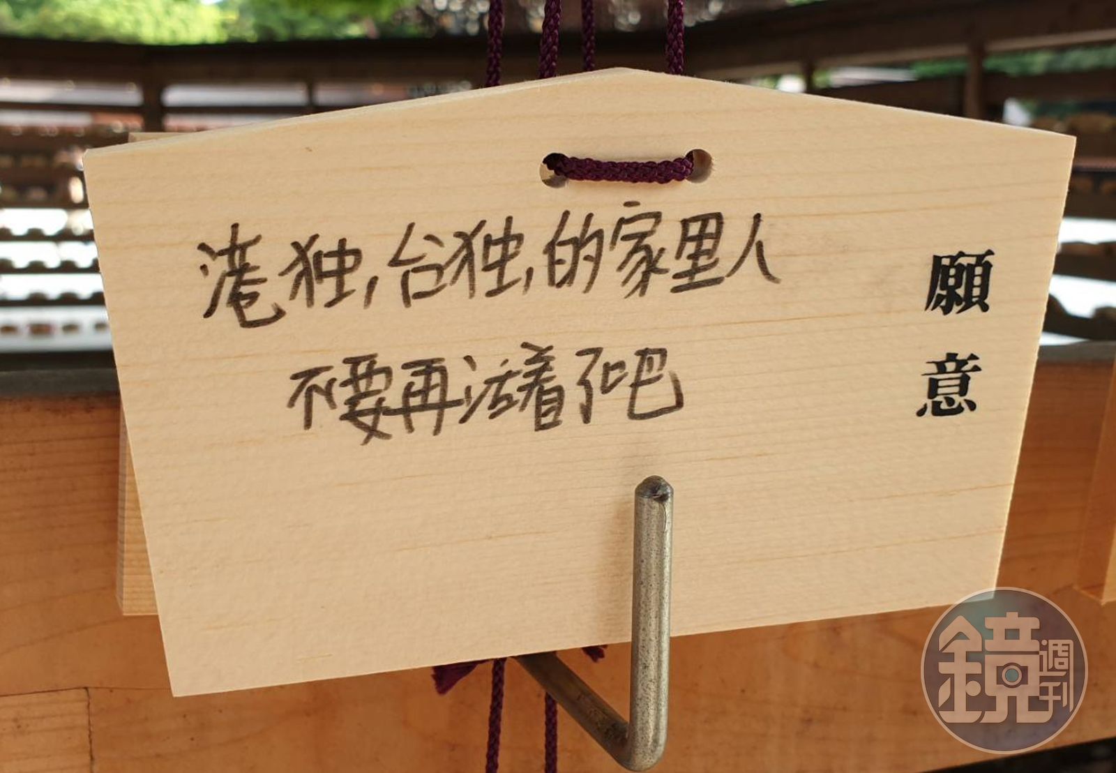 只見照片中的3塊許願牌,分別被寫上「港獨、台獨的家裡人,不要再活著了吧」「願所愛之人,愛我之人、皆身體健康、事業順利,支持台灣獨立,台灣是中國不可分割的一部分,We are one China 令和元年八月三日」。甚至有不堪入目的內容提到「你光復你媽B的香港呢?港獨立馬全家暴斃嗷…憨逼玩意兒,LOW逼,死好,中國萬歲,什麼XX玩意,港獨。」