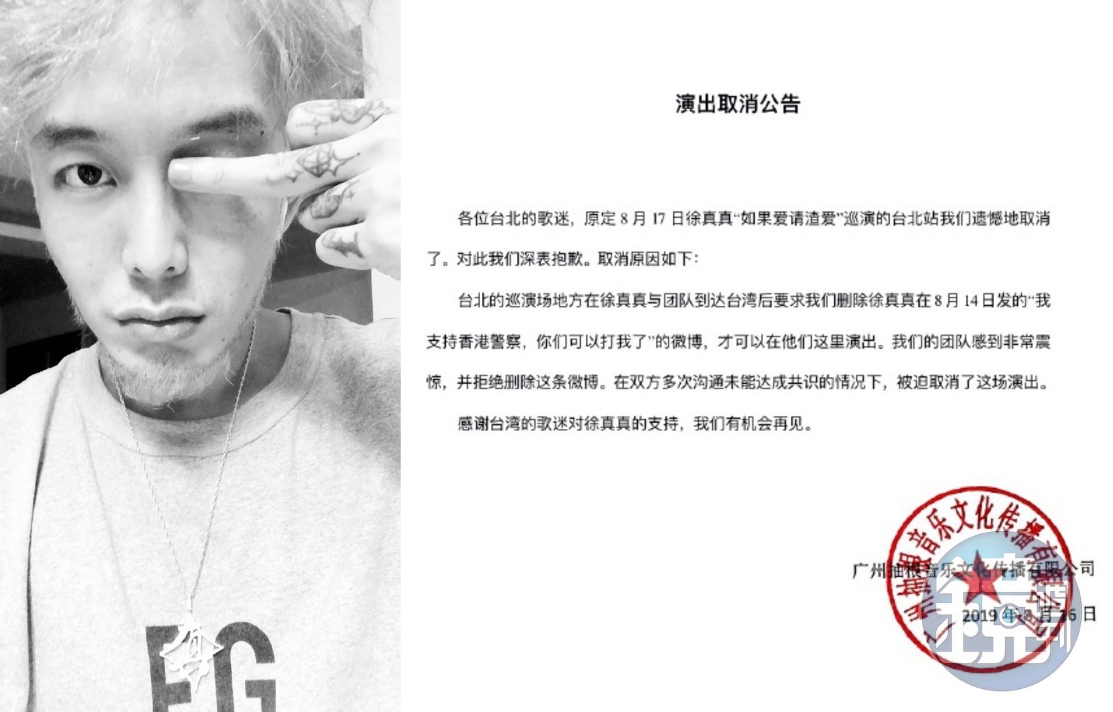 曾參加中國大陸選秀節目《中國有嘻哈》的嘻哈歌手徐真真,原訂今(17日)晚上於台北The Wall舉辦「如果愛 請渣愛」演唱會,徐真真今早在微博與IG上傳演出取消公告,內容表示由於台北演唱場地要求他刪除日前發的「挺港警宣言」後,才能進行演出,雙方溝通無效,被迫取消演出。對已購票的歌迷感到抱歉。
