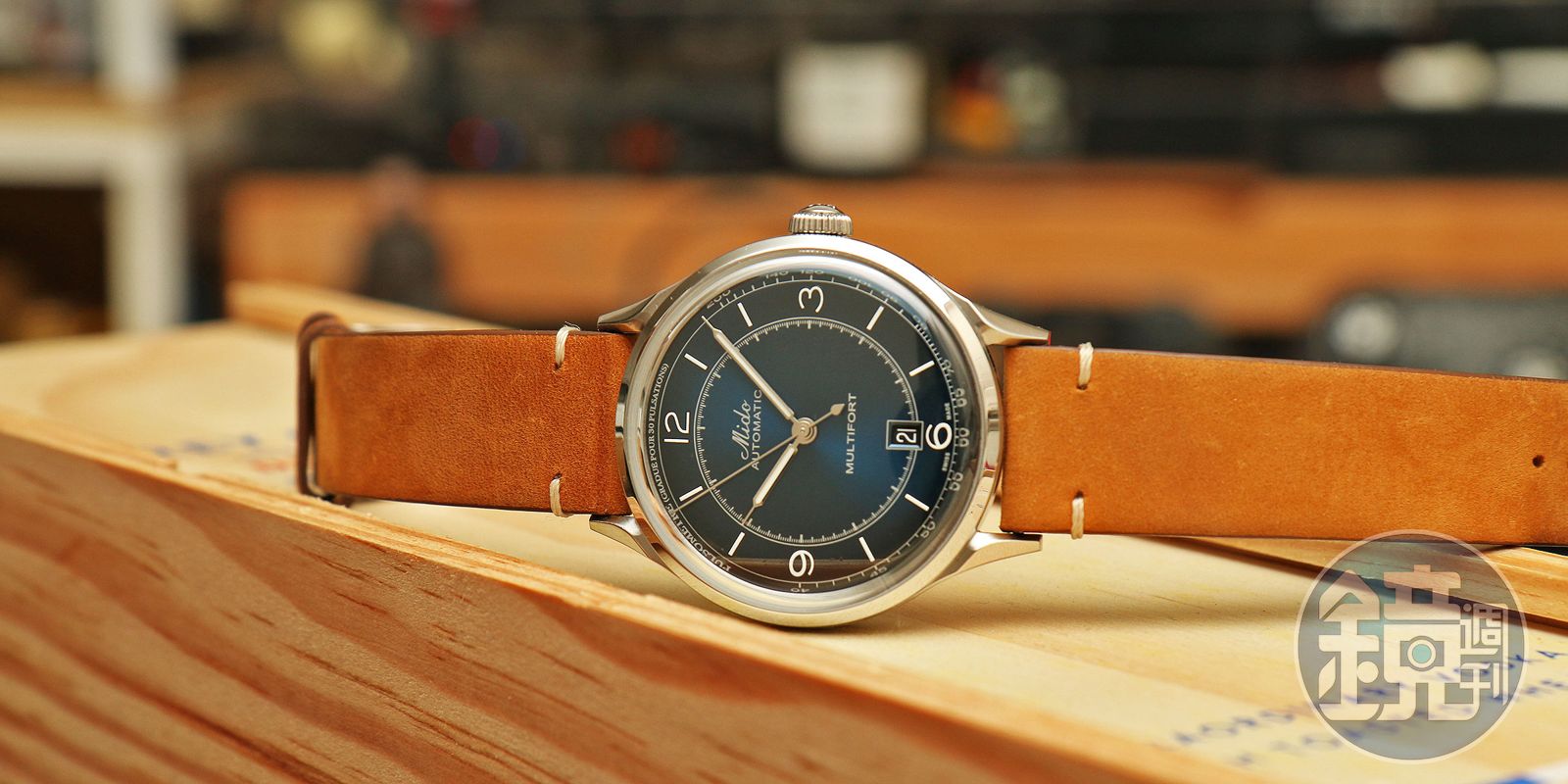 為了增加產品的復古感,Multifort Patrimony腕錶的藍寶石水晶鏡面採用凸面箱型設計,而且放射紋路的面盤與指針的造型也很典雅;另外像是復古的草寫MIDO Logo、阿拉伯數字的字體,這些細節也都滿講究的。個人覺得有趣的地方是它的錶耳,錶殼本身的尺寸是40mm,這點是符合現代配戴需求而來,做為一款復刻錶還在我能夠接受的範圍,不過錶耳收得更短小簡練,這點倒是整體感覺更小了些,更有老味。