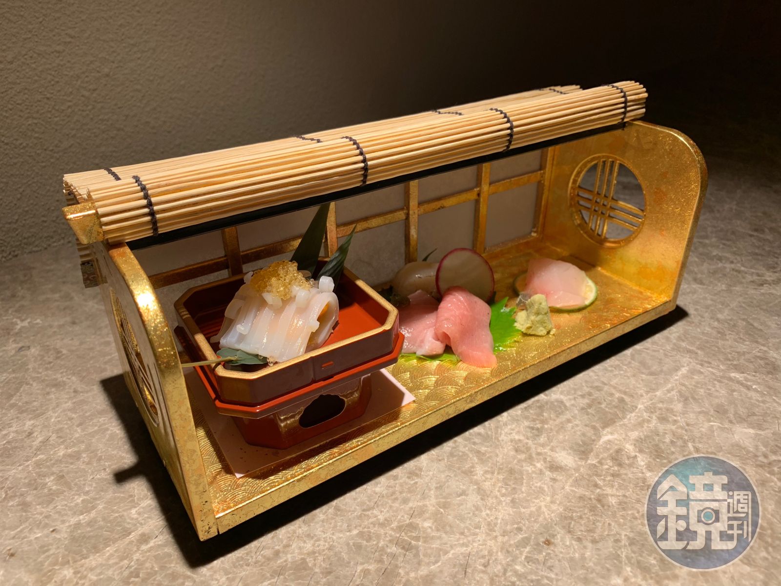 按會席料理的順序來說,第2道應該為刺身,但料理長刻意更換為烤物「澳洲和牛舌」,因為要展現耗資百萬打造的鑄鐵炭燒窯爐,重達200公斤的窯烤爐,中心溫度可達攝氏500度,零死角的均勻加熱,讓取自澳洲9+和牛的牛舌,嘗來外脆內嫩,甜香不油,配著盛夏的綠竹筍更爽口。