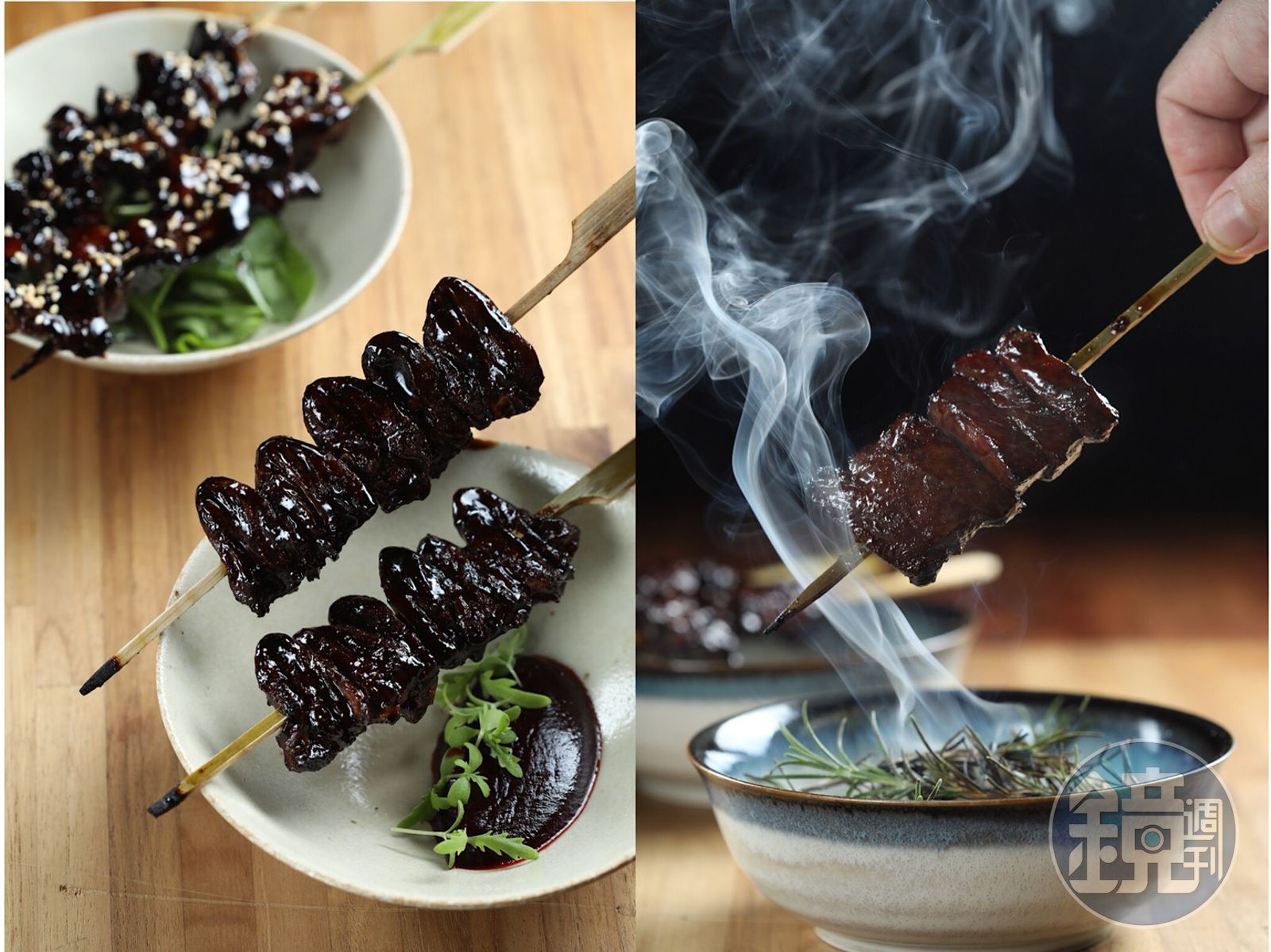 「我用小薏仁取代米做米麴,味道更甜;用黑萊姆、黑蒜頭做成串燒蘸醬,柔和烤肉醬的鹹度;用九層塔釀成的康普茶帶台式風味。」調味都是山男限定,烤得醬香惹味的「牛小排 馬鈴薯 」「雞胗 芝麻菜 」,全是北歐和日式料理的聯手滋味。